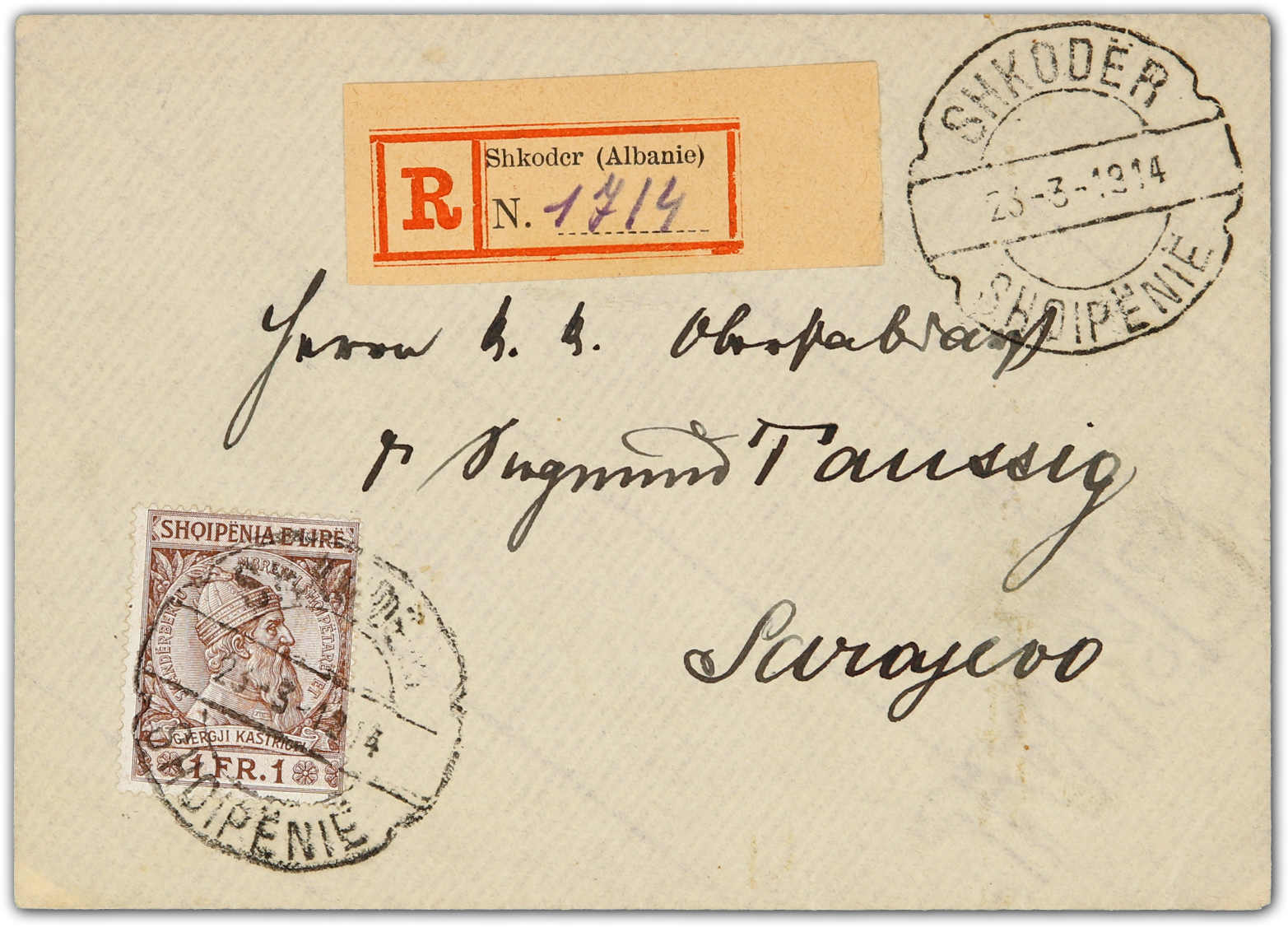 5045 Brief Michel:34 image1914, cover sent from Shkoder to Sarajevo/Bosnia bearing single franking of Skanderbeg issue 1 Fr,, tied by "SHKODER/SHOIPENIE" cds, alongside three color registration label of Shkoder N.1714 (Image) (imagea)