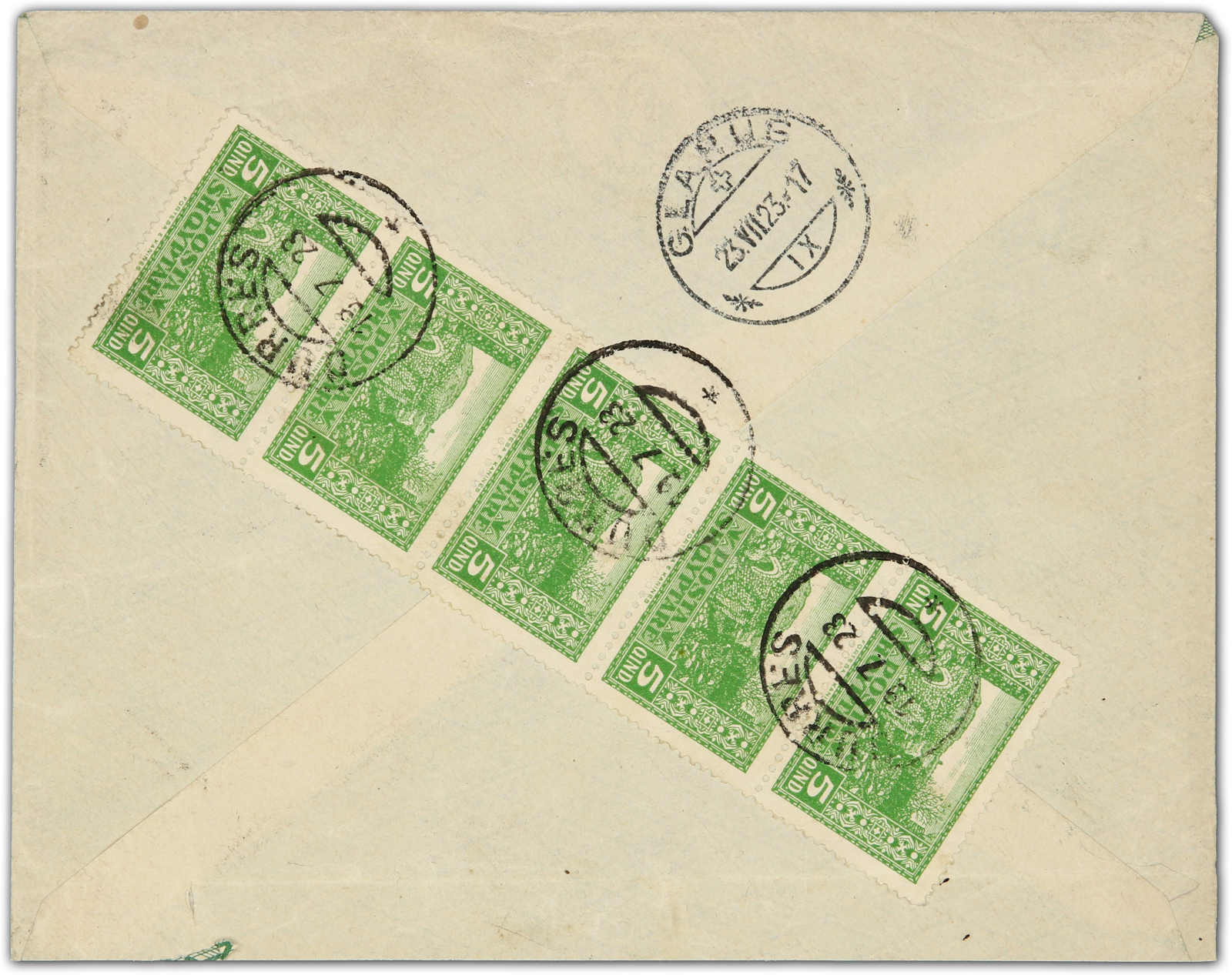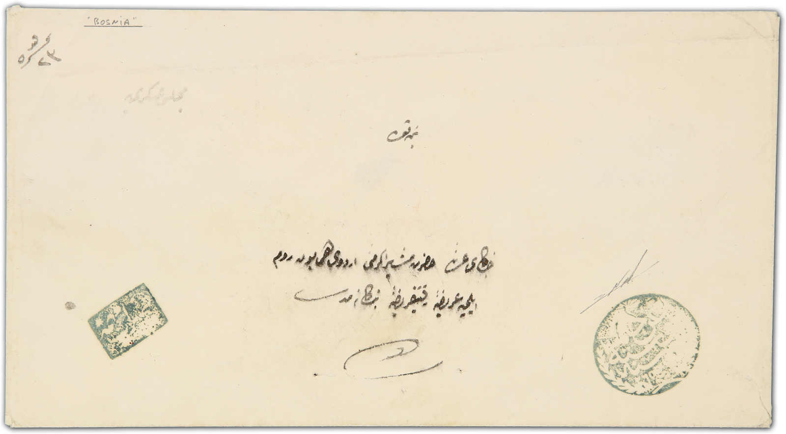 5049 Brief imageBosnia: official cover from Bosnia to Constantinople with fine strike of all Arabic negative "An Canib-i Posta-i Bosna 265" handstamp (Coles & Walker fig. 1), with alongside boxed negative "Tahrirat-i Mühimme" (= "Official Correspondence") also in black, weight 5 Dirhem / postal charge 23 piastres in manuscript at upper left, signed Nakri. (Image) (imagea)