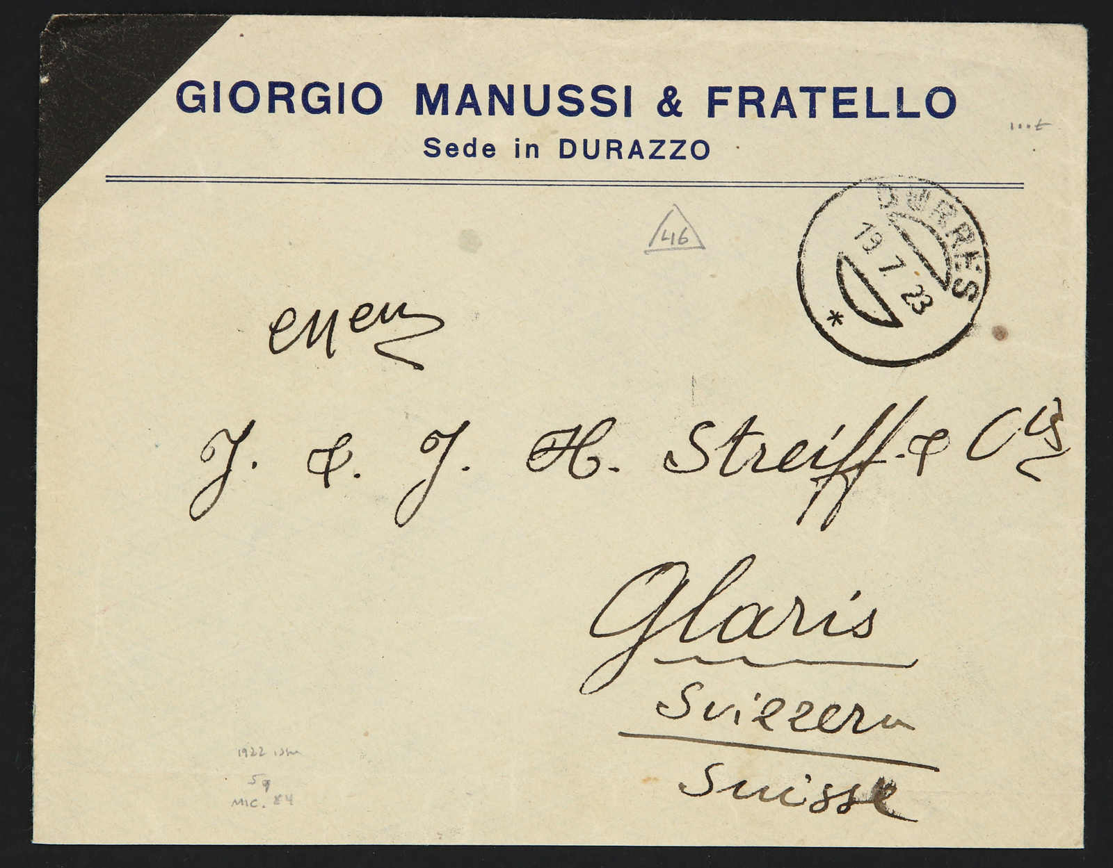 5046 Brief Michel:84 image1923, cover sent from Durazzo to Switzerland bearing on reverse side strip of five 5 q, of 1922 issue green tied by "DURRES" postmarks. (Image) (imagea)