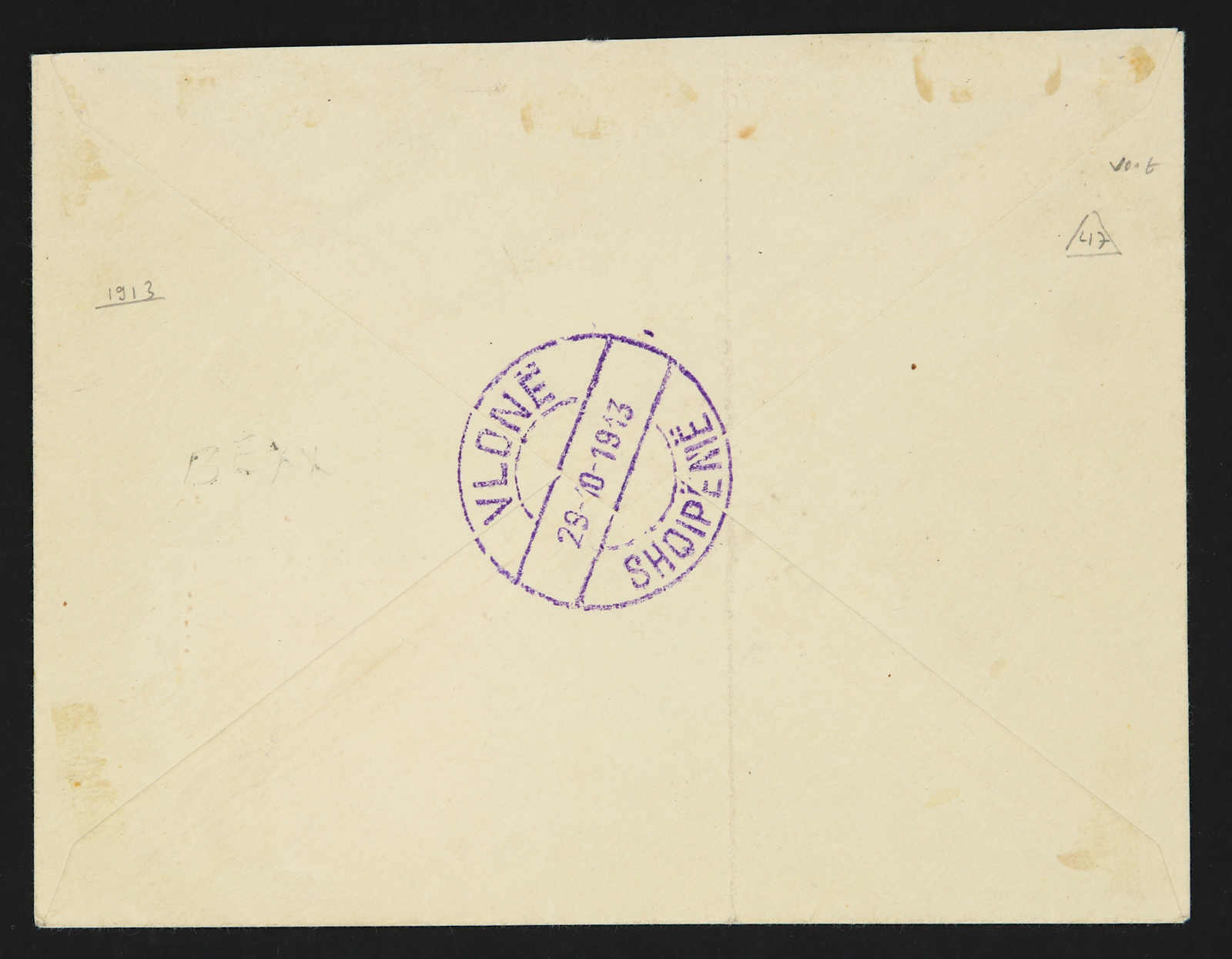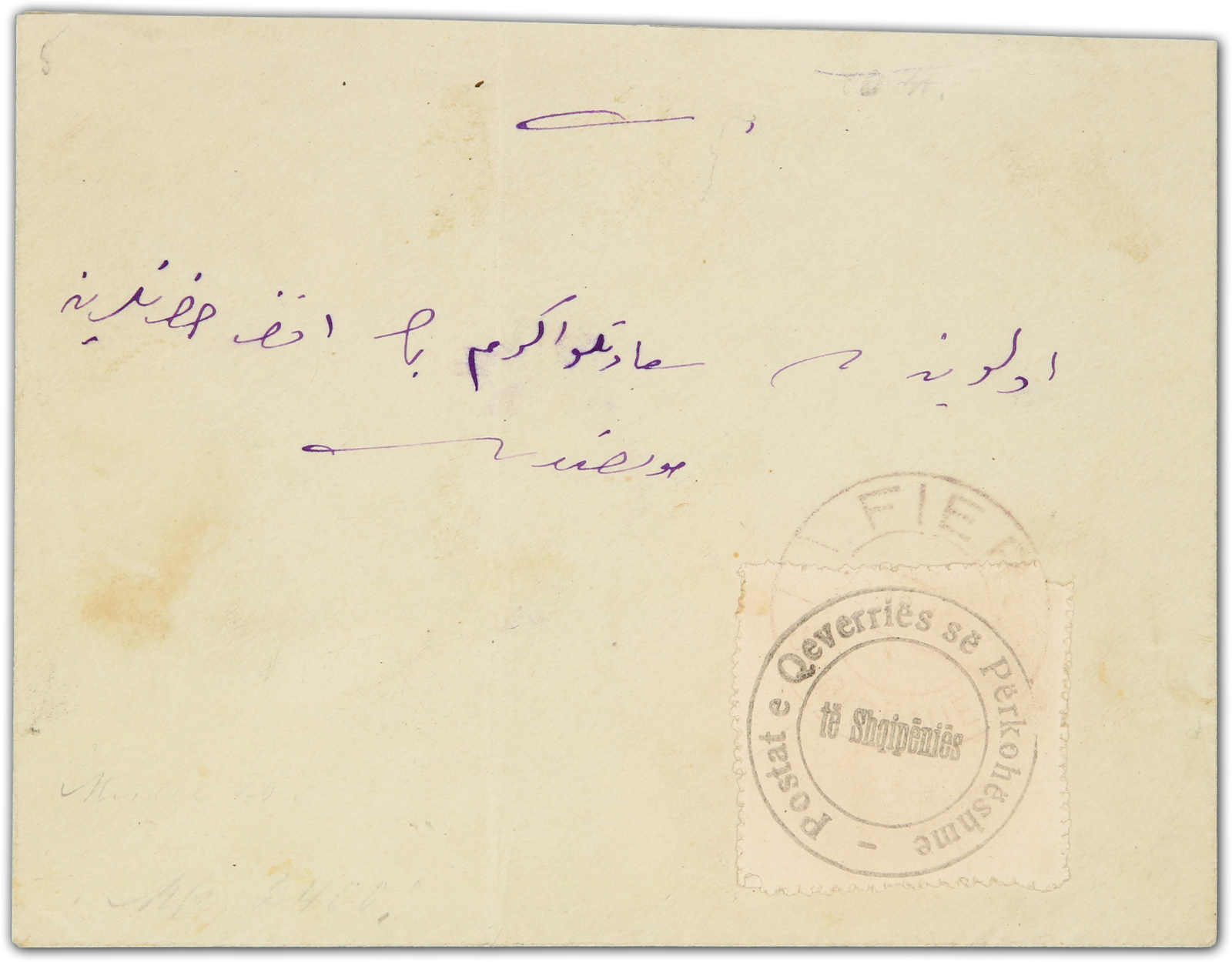 5047 Brief Michel:2A image1913, single franking cover sent from Fier to Avlonya bearing 1913 issue undenominated served as 1 pia, grey on white horizontally laid paper without watermark sewing machine perforated on all sides (Scott.20a) cancelled and tied by "FIER" postmark, on reverse arrival cds (Image) (imagea)