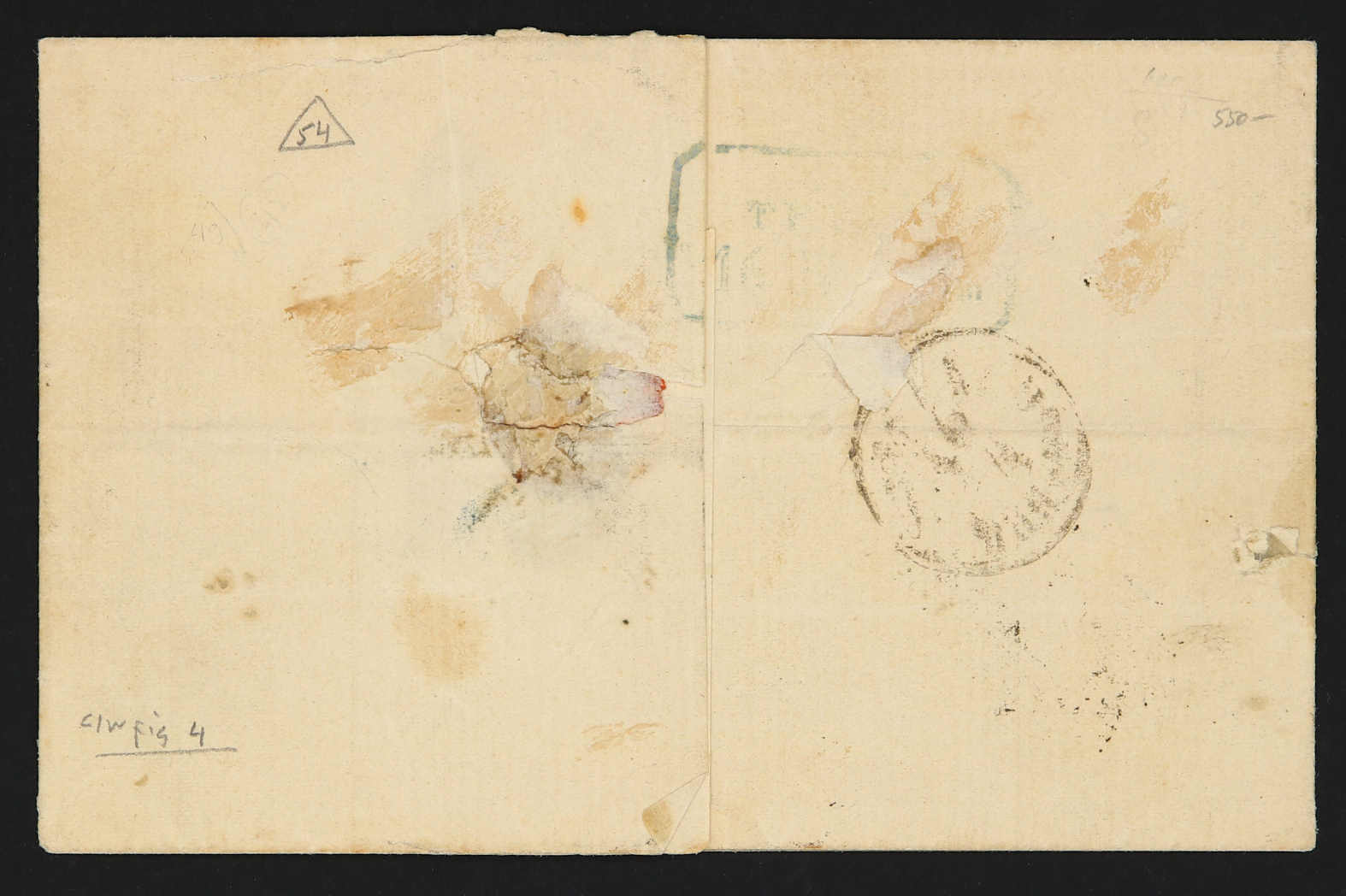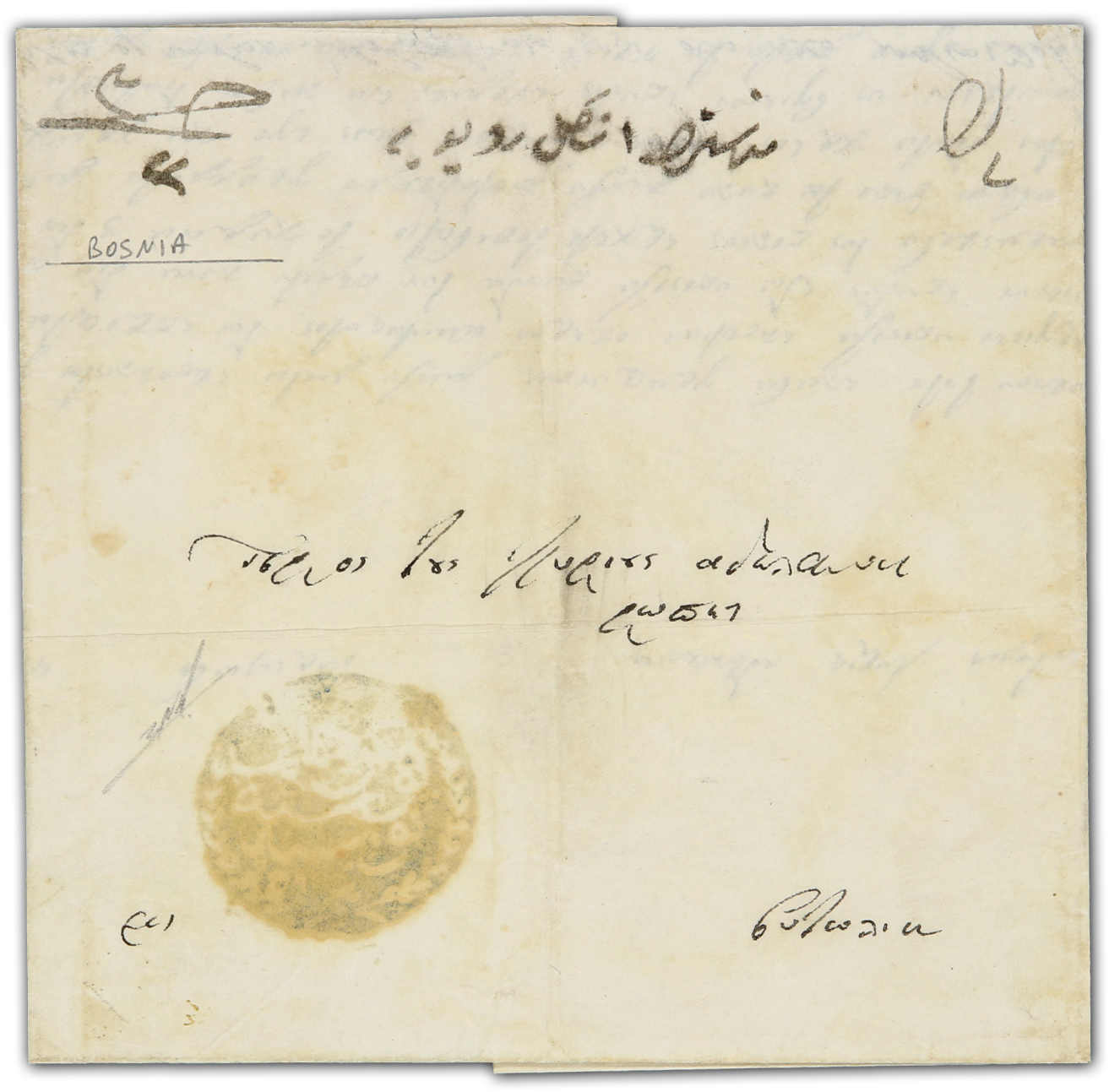 5048 Brief imageBosnia: 1848/60 approx., entire letter from Bosnia to Manastir (now Bitolia) showing fine all Arabic negative "An Canib-i Posta-i Bosna 265" handstamp in greenish (Coles & Walker fig. 1), with weight 3 Dirhem / postal charge 3 piastres in manuscript at top (Image) (imagea)