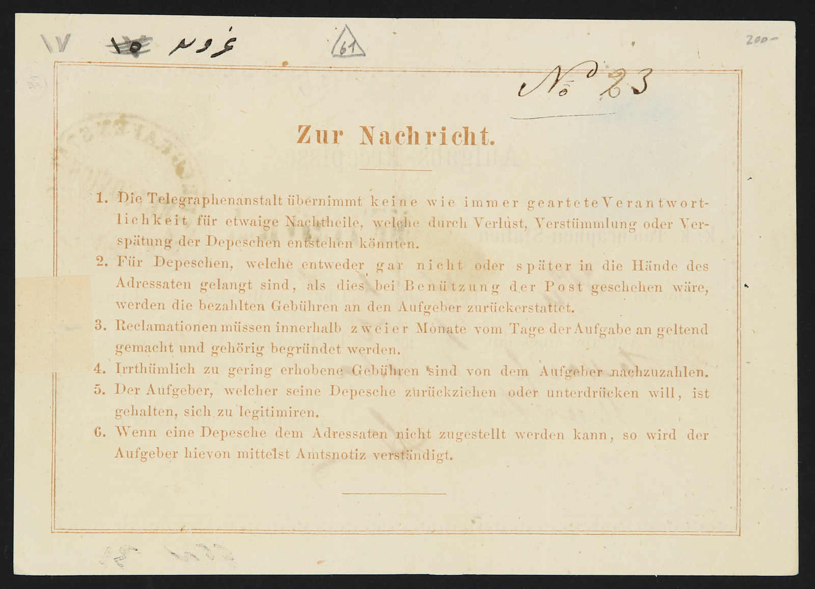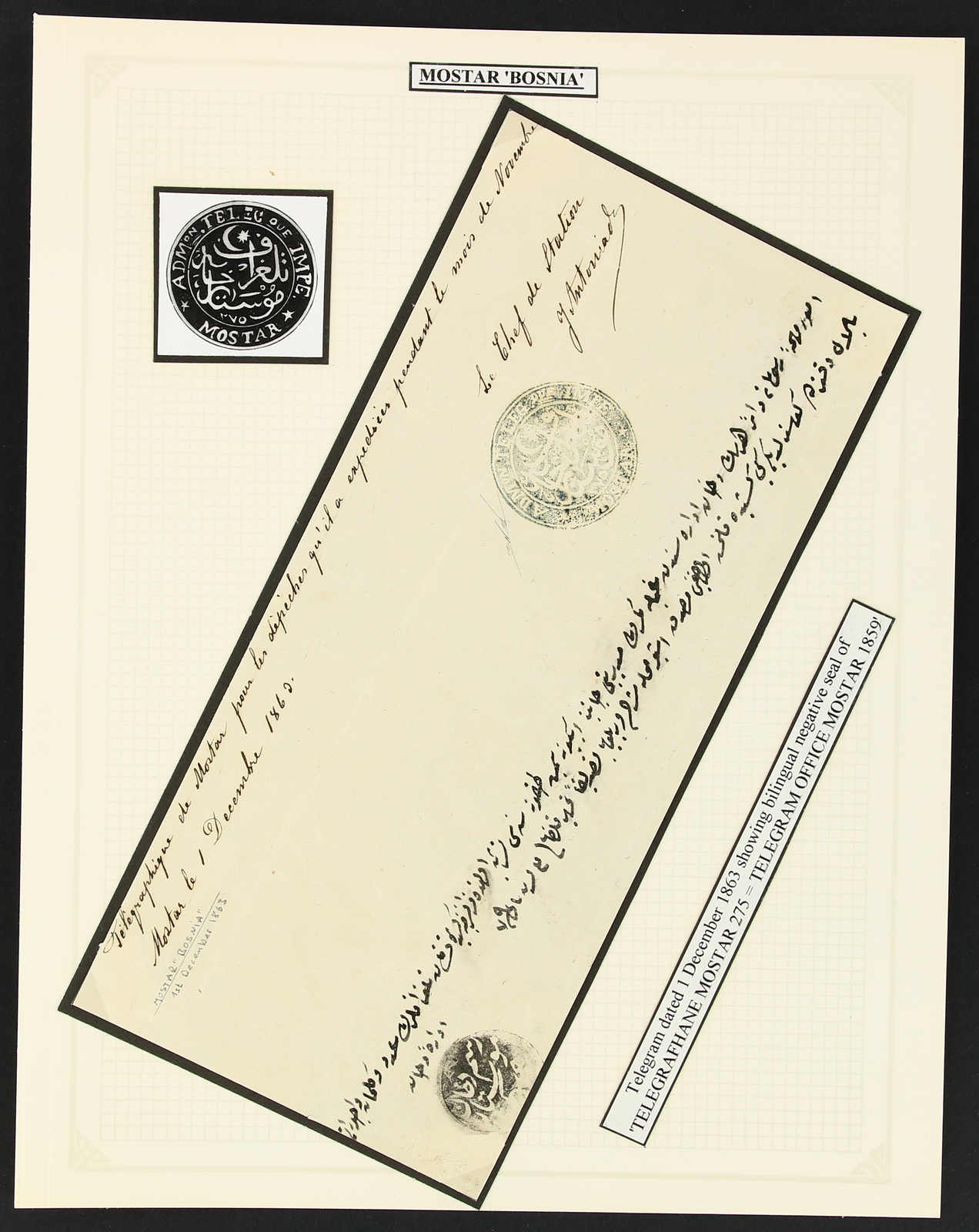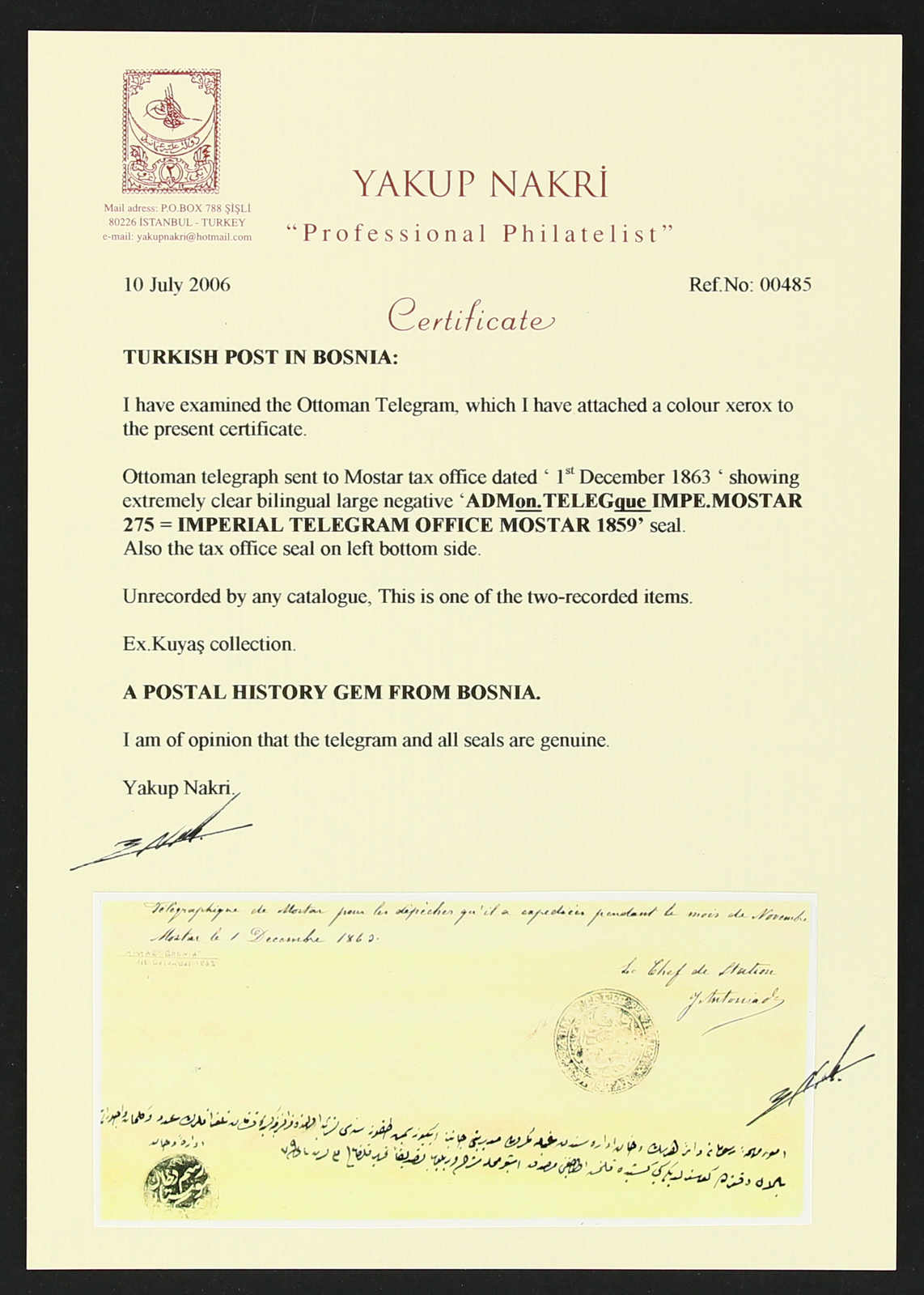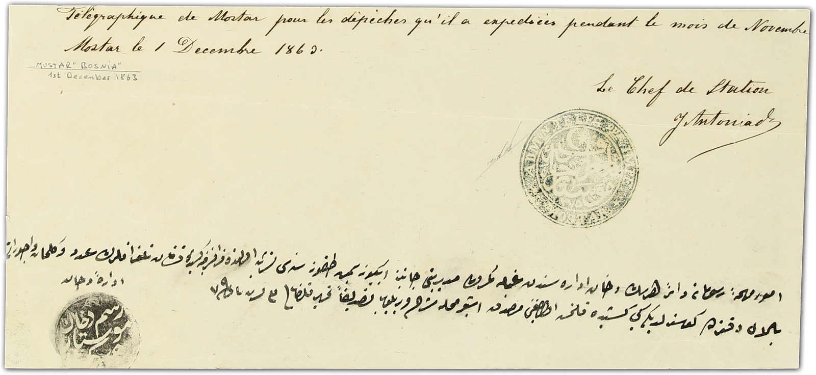 5050 Brief imageMostar: 1863, Receipt for Telegraph sent to Mostar Tax Office dated "1st December 1863" showing extremely clear bilingual circular negative "ADMon TELEGque IMPE.MOSTAR 275" (="IMPERIAL TELEGRAM OFFICE MOSTAR 1859") handstamp in black, with the Tax Office negative seal at lower left, unrecorded by any catalogue, this is one of the two recorded items! Extremely rare and most attractive, cert. Nakri (2006), provenance: Collection S. Kuyaş. (Image) (imagea) (imageb)