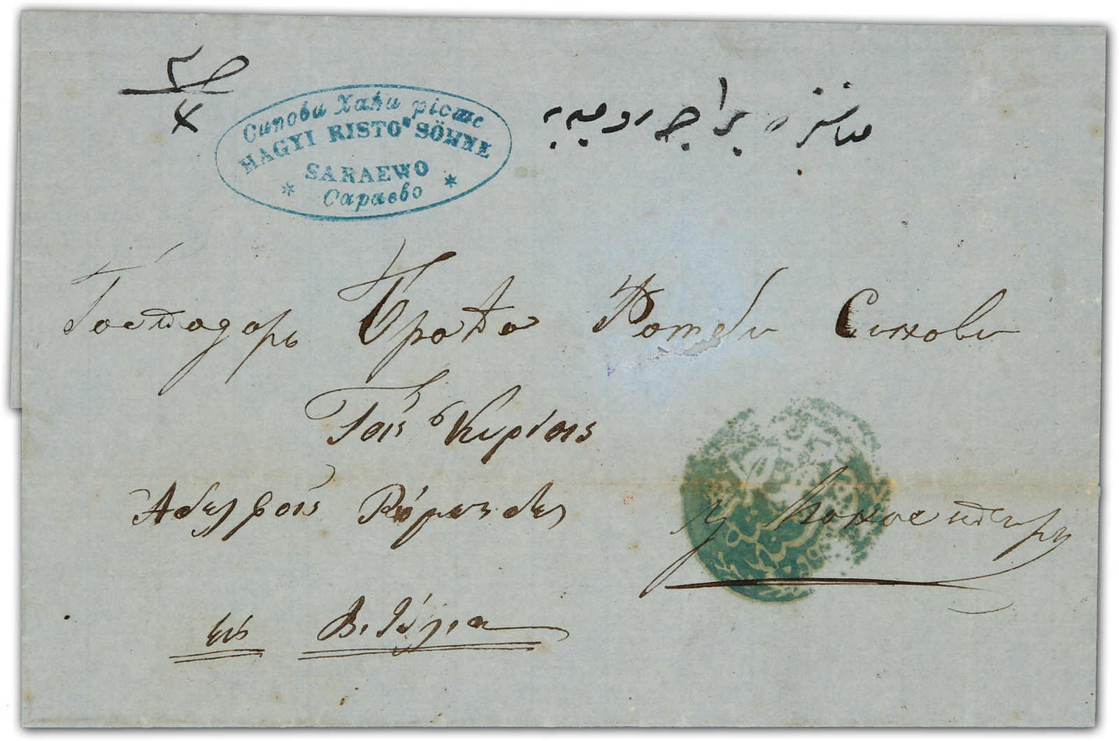 5051 Brief imageBosnia: 1848/60 approx., cover from Bosnia to Manastir (now Bitolia) showing very fine all Arabic negative "An Canib-i Posta-i Bosna 265" handstamp in greenish blue (Coles & Walker fig. 1) with weight 3 Dirhem / postal charge 3 piastres in manuscript at top, also showing "Hagyi Risto Söhne/Sarajevo" Company cachet at upper left (Image)