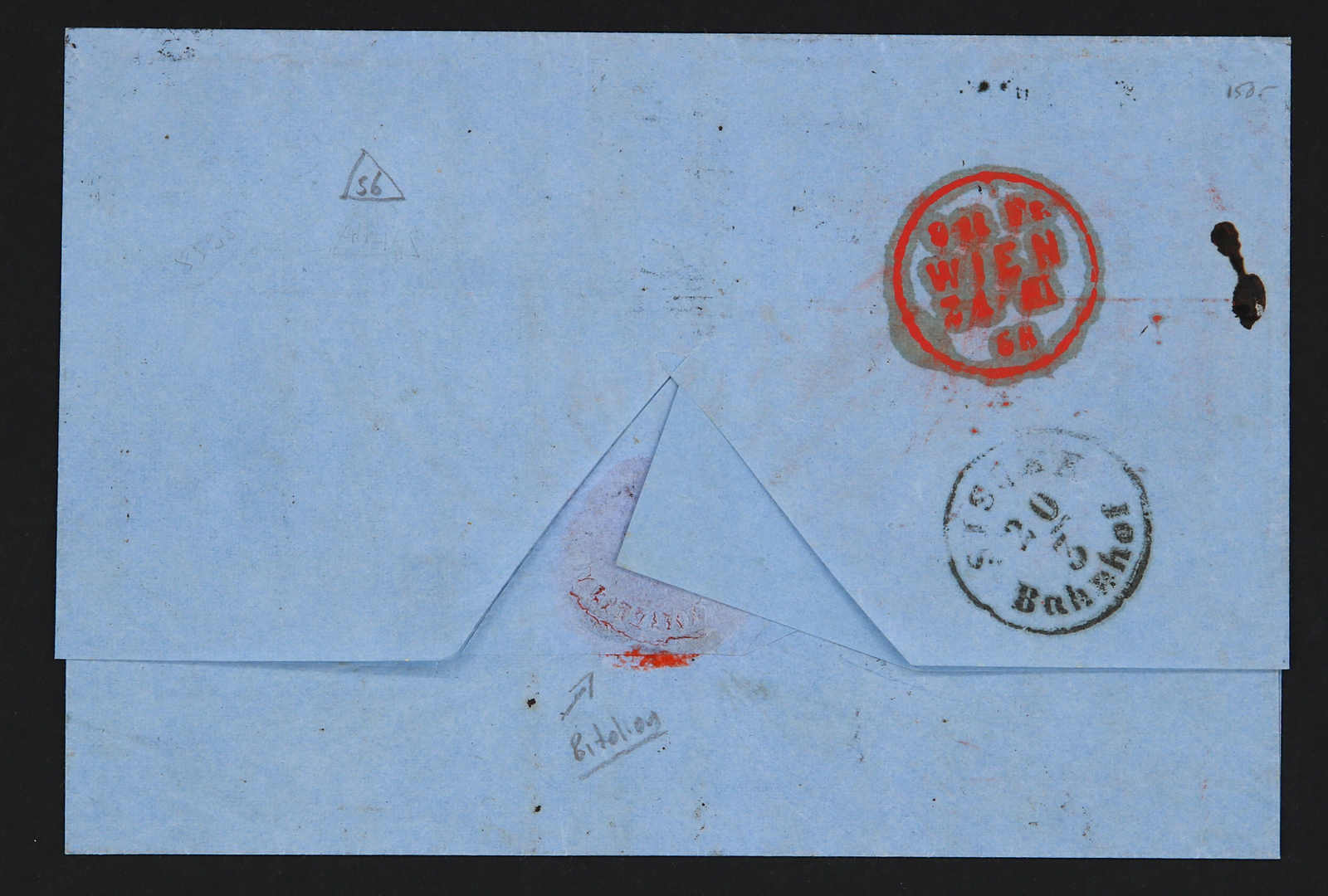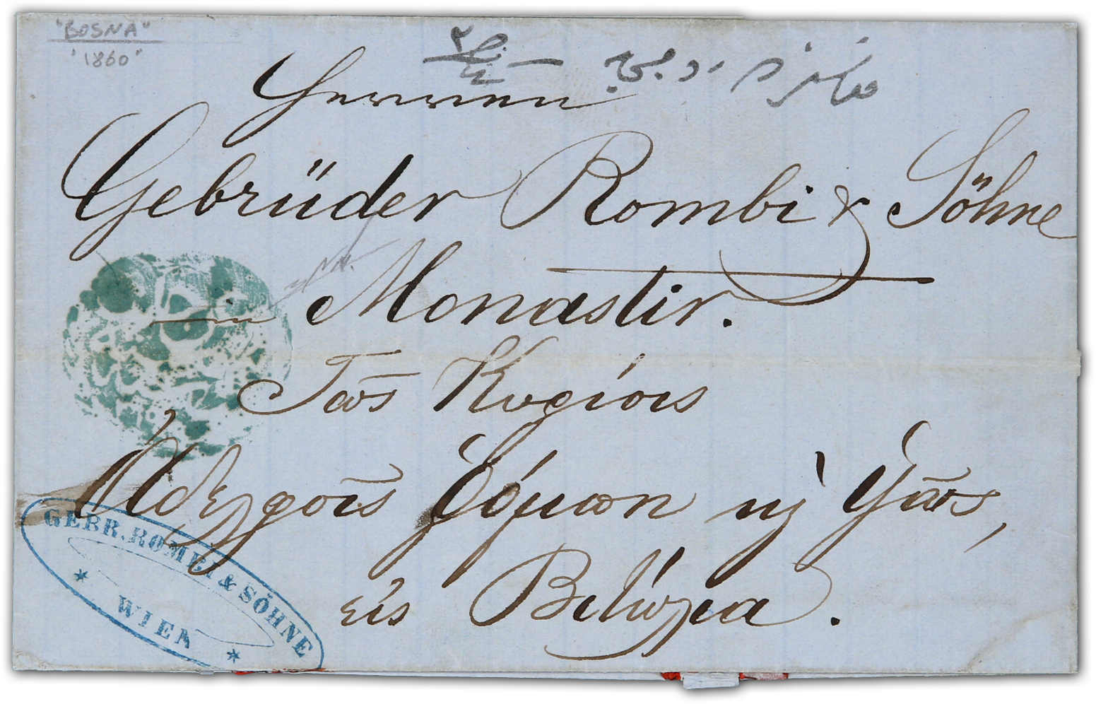 5052 Brief imageBosnia: 1860, cover from Vienna (sender's cachet at lower left) to Manastir (now Bitolia) via Bosnia showing very fine all Arabic negative "An Canib-i Posta-i Bosna 265" handstamp in greenish-blue ink (Coles & Walker fig. 1) with weight 2 Dirhem / postal charge 4 piastres in manuscript at top, the postage of 4 piastres collected for Ottoman territory from the Ottoman Empire border to Manastir, signed Nakri (Image)