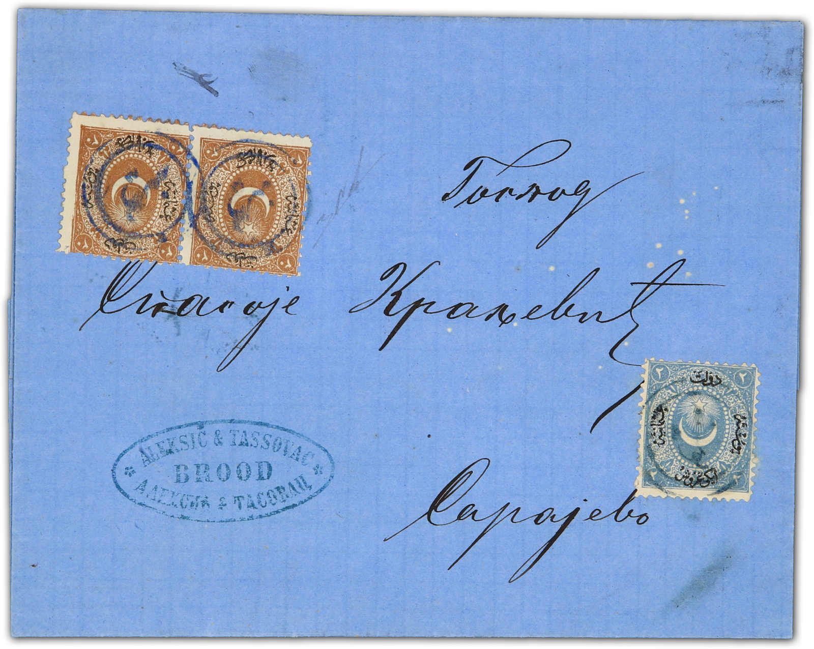 5053 Brief Michel:12,P10 imageBosnia and Herzegovina-Bosnia: 1868, entire letter sent from Brood to Sarajevo the postage fee collected in arrival by very rare 1867 issue Duloz stamps pair Postage Due 20 para light brown & 2 piastres grey blue, tied by all Arabic double-circle "Bosna 81" blue handstamps (Coles & Walker fig. 4), signed Nakri (Image)