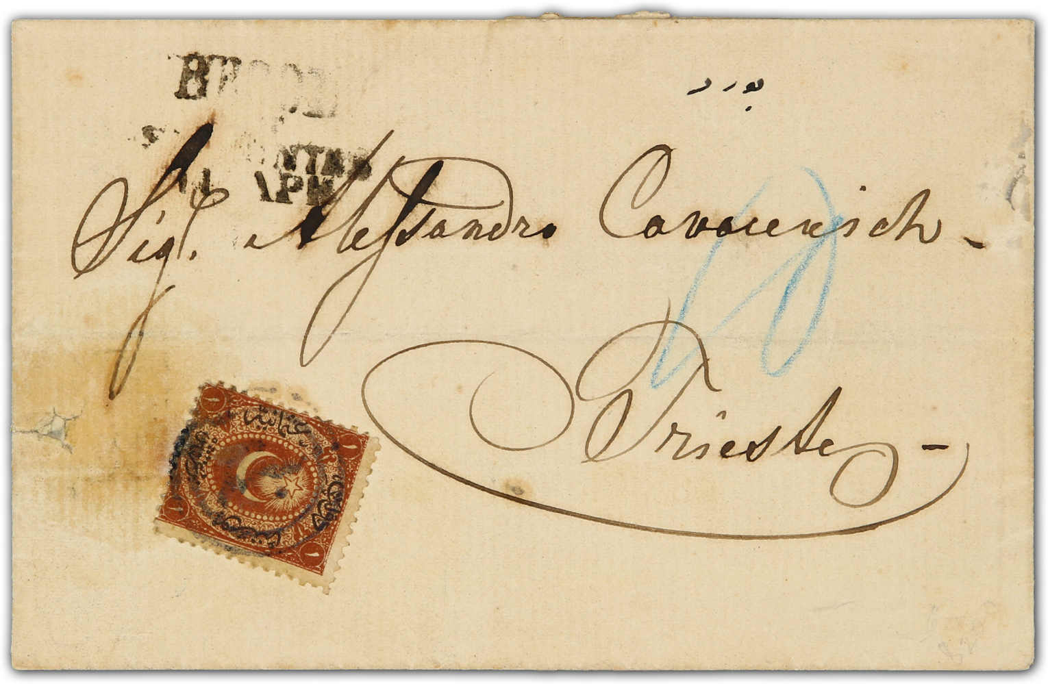 5054 Brief Michel:P6 imageSlavonski Brod: 1865, entire letter from Bosnia to Triest bearing 1865 postage due issue 1 piastre tied by all Arabic double-circle "BOSNIA 81" handstamp (Coles & Walker fig. 4), alongside showing four line dated "BROOD / IN / SLAVONIEN / 11 APR". in black and by manuscript "20" charge manuscript in blue, reverse with Sissek/Bahnhof transit cds and Triest rectangle arrival in blue (Image) (imagea)