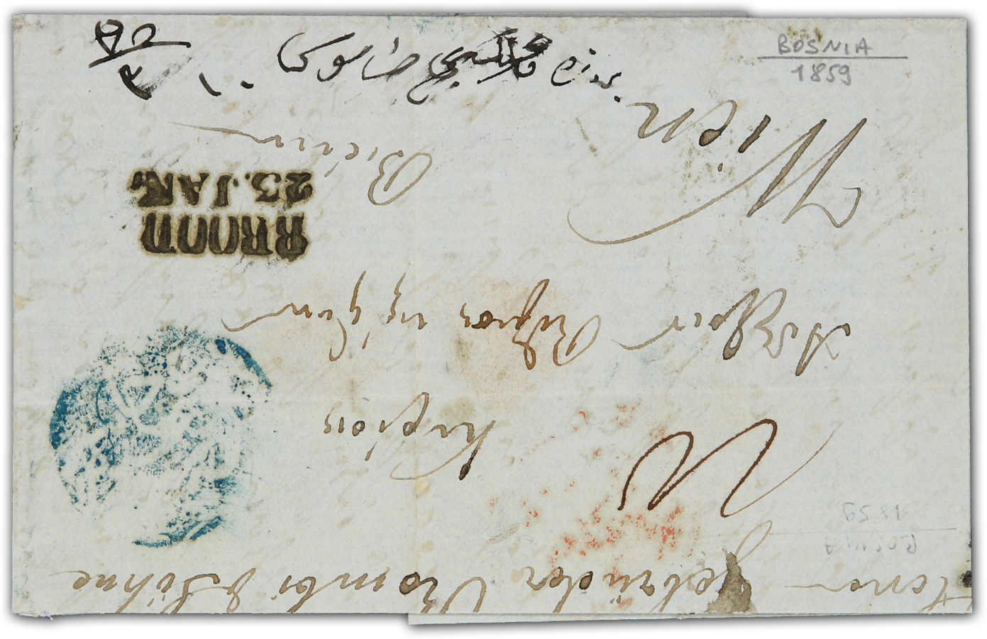 5055 Brief imageSlavonski Brod: 1859, entire letter from Bosnia to Vienna showing all Arabic blue negative "An Canib-i Posta-i Bosna 265" handstamp (Coles & Walker fig. 1), rated at top (weight 3 Dirhem / postal charge 2 piastres 10 para) in manuscript, alongside showing double line dated "BROOD / 23 JAN." in black, reverse with circular "NETTO DI DENTRO ET DI FUORI" disinfection cachet in black and oval (21/1) Vienna arrival cds in red (Image) (imagea)