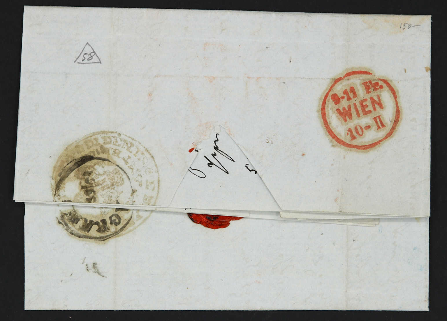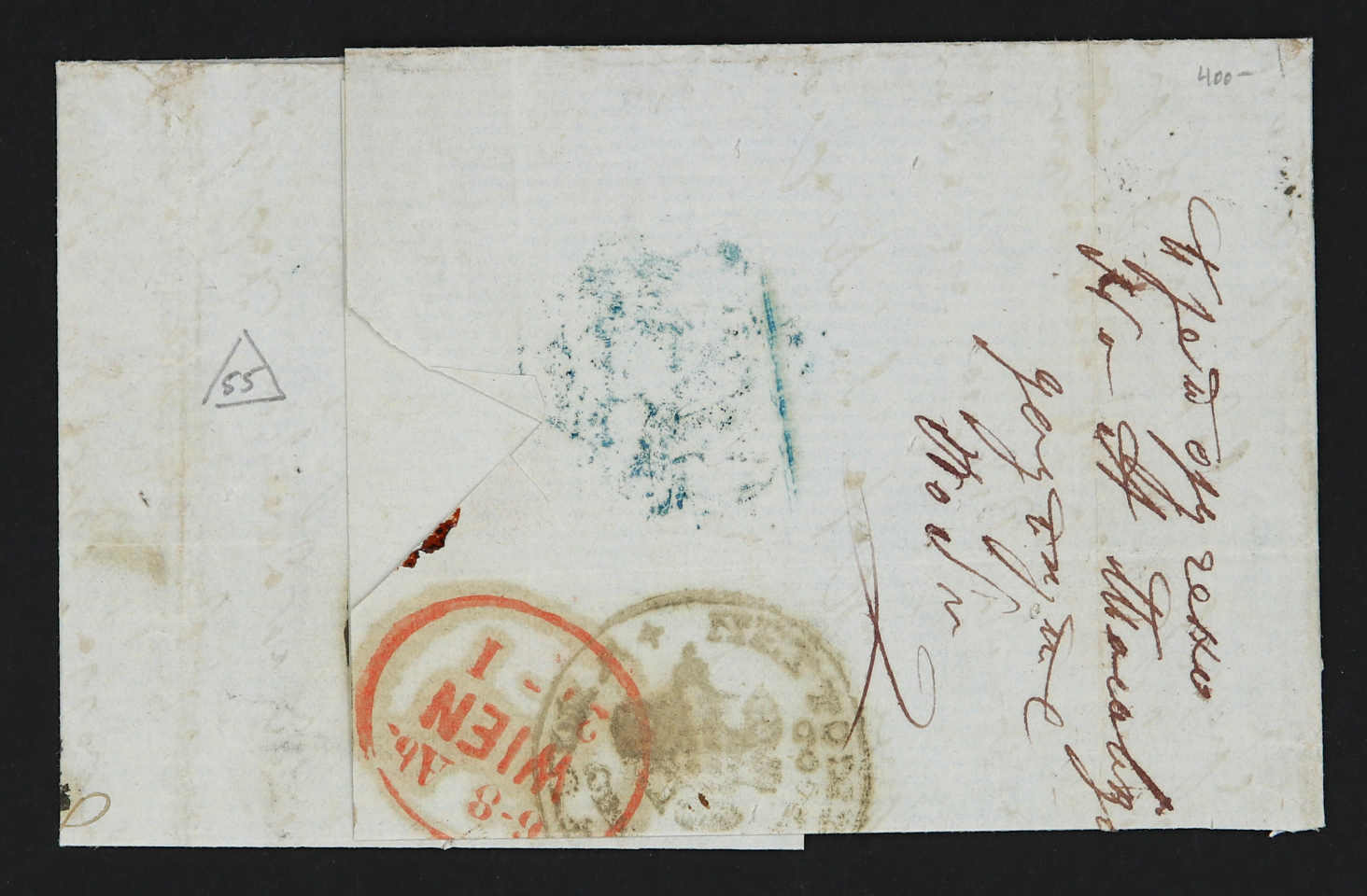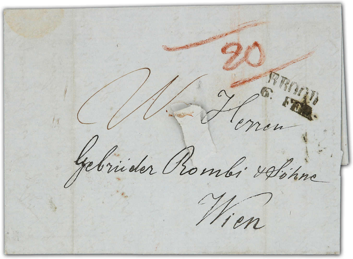 5058 Brief imageSlavonski Brod: 1859, entire letter from Bosnia to Vienna showing double line dated "BROOD / 6 FEB." in black handstamp, reverse with circular "NETTO DI DENTRO ET DI FUORI" disinfection cachet in black and Agram transit and Wien (10/2) arrival cds in red (Image) (imagea)