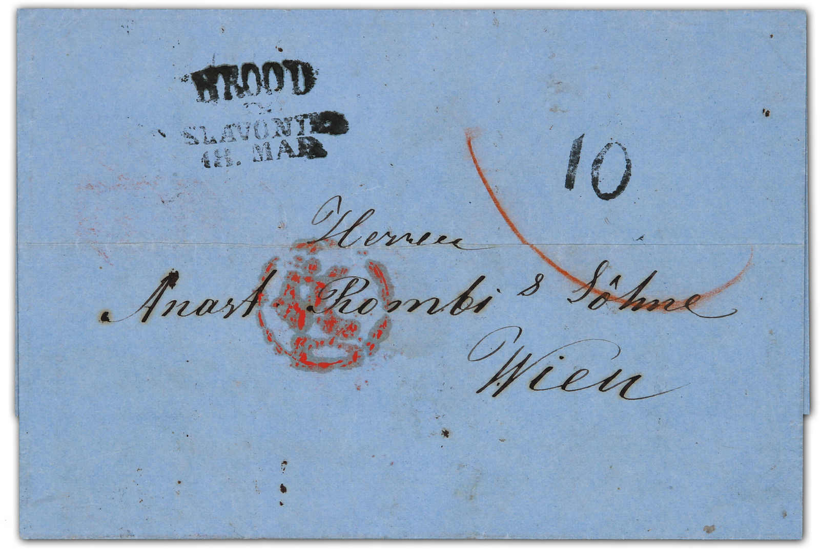 5056 Brief imageSlavonski Brod: 1868, cover from Bitolia (Manastir/Macedonia) to Vienna showing four line dated "BROOD / IN / SLAVONIEN / 18 MAR." in black and struck with "10" charge marking in black, reverse with Sissek / Bahnhof transit cds (20/3) and Vienna arrival cds in red, scarce (Image) (imagea)