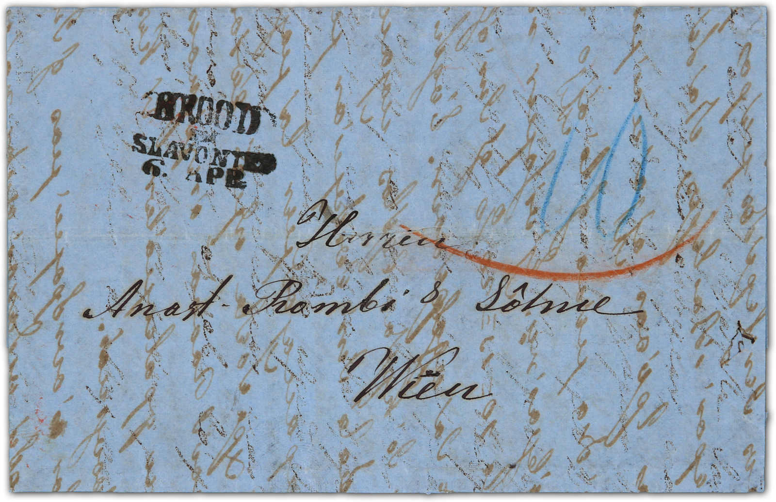 5057 Brief imageSlavonski Brod: 1868, entire letter from Bitolia (Manastir/Macedonia) to Vienna showing four line dated "BROOD / IN / SLAVONIEN / 6 APR." in black and by manuscript "10" charge marking in blue, reverse with Sissek / Bahnhof transit cds and Vienna arrival cds in red (Image) (imagea)
