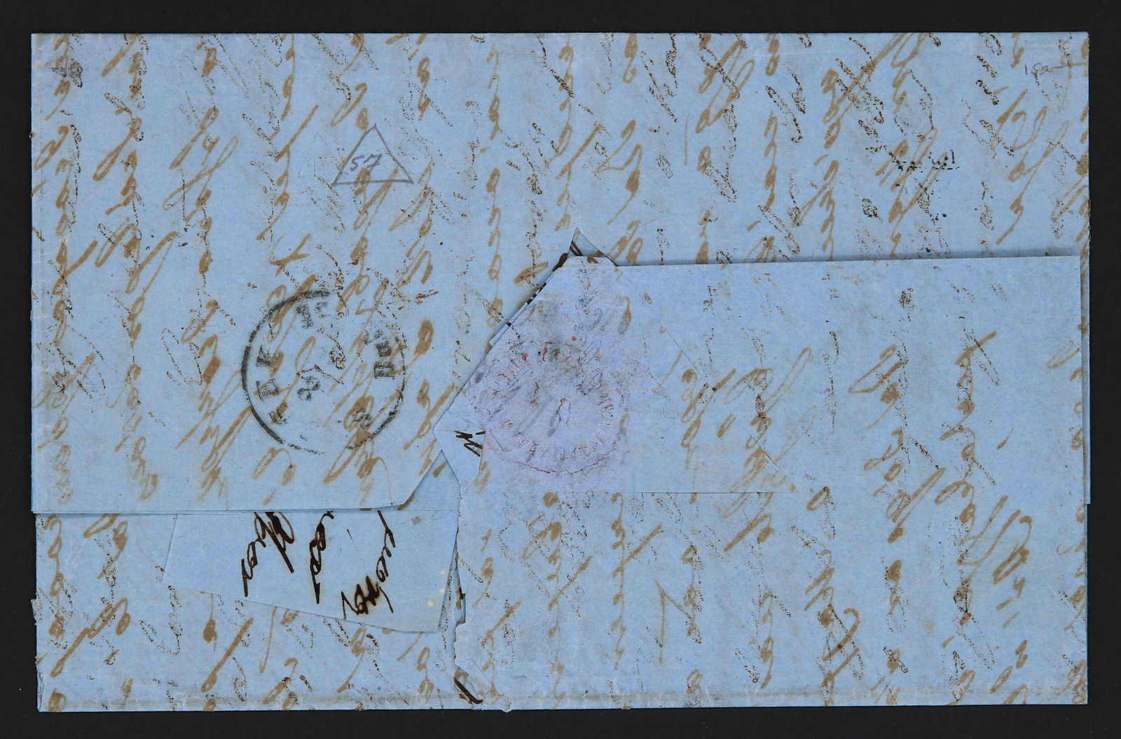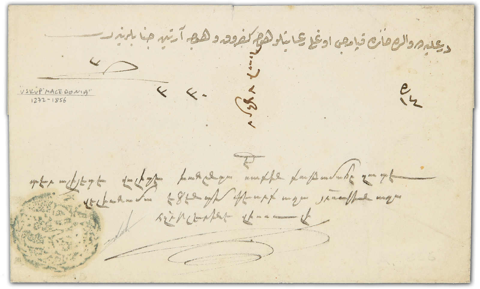 5062 Brief imageSkopje-Üsküp: 1856, entire letter from Skopje to Constantinople showing very fine all Arabic negative "An Canib-i Posta-i Üsküp 265" handstamp in blue (Coles & Walker fig. 125) with weight 3 Dirhem / postal charge 3 piastres 30 paras in manuscript (Image) (imagea)