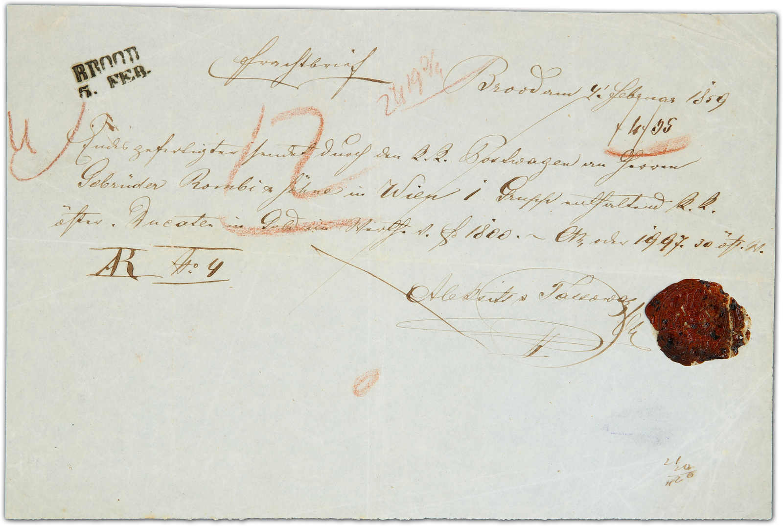 5059 Brief imageSlavonski Brod: 1859, postal waybill dated "4 February 1859" for 1800 fl. sent from Brod to Vienna showing very fine double line "BROOD / 5 FEB." in black, very unusual, scarce item! (Image)