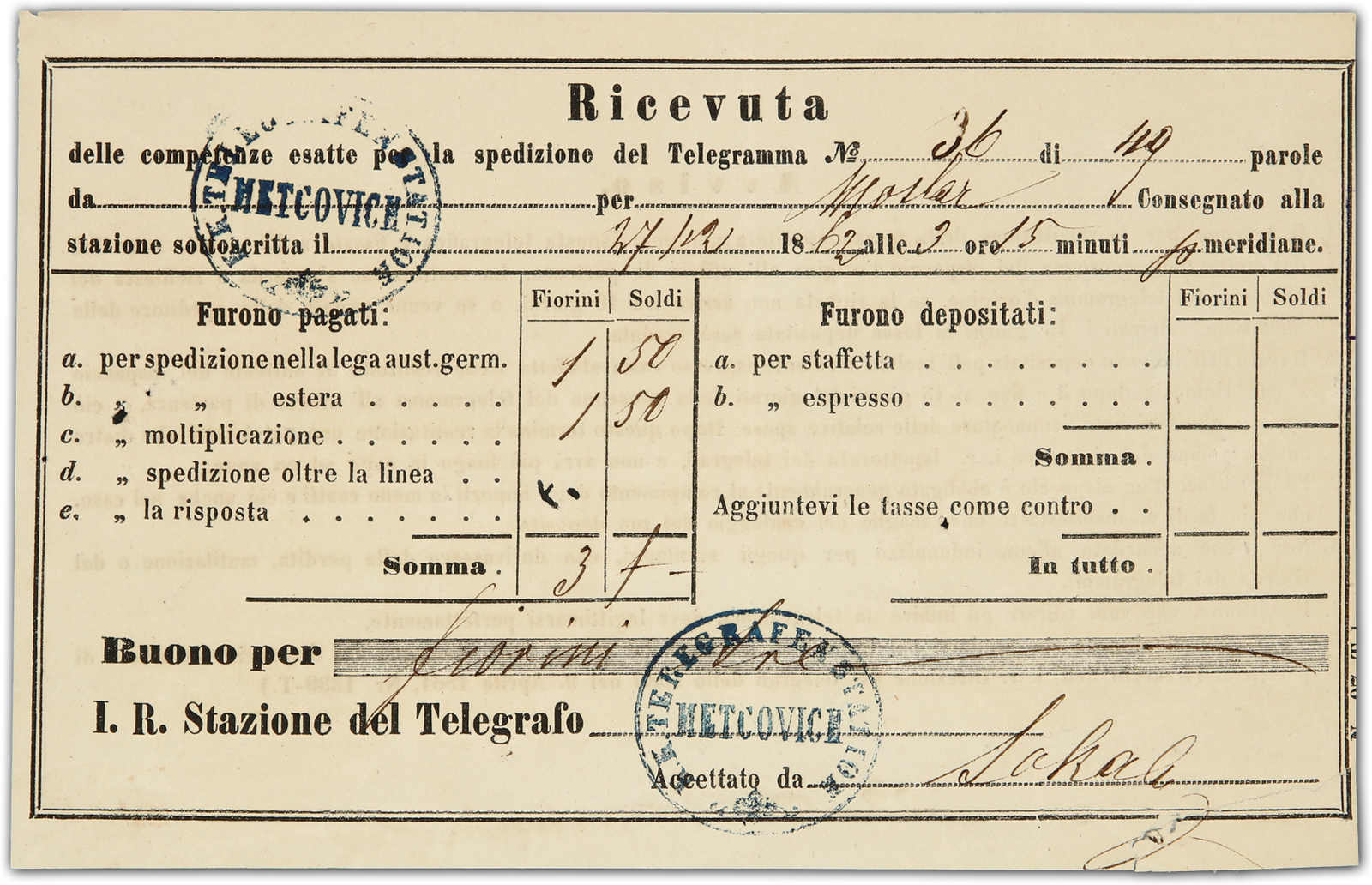 5060 Brief imageMetkovi-Metcovich: 1862 (Dec 27), telegram receipt form for telegraph to Mostar showing two fine strikes of oval framed "K. K. Telegrafen Station / METCOVICH" handstamps in blue-black (Image) (imagea)