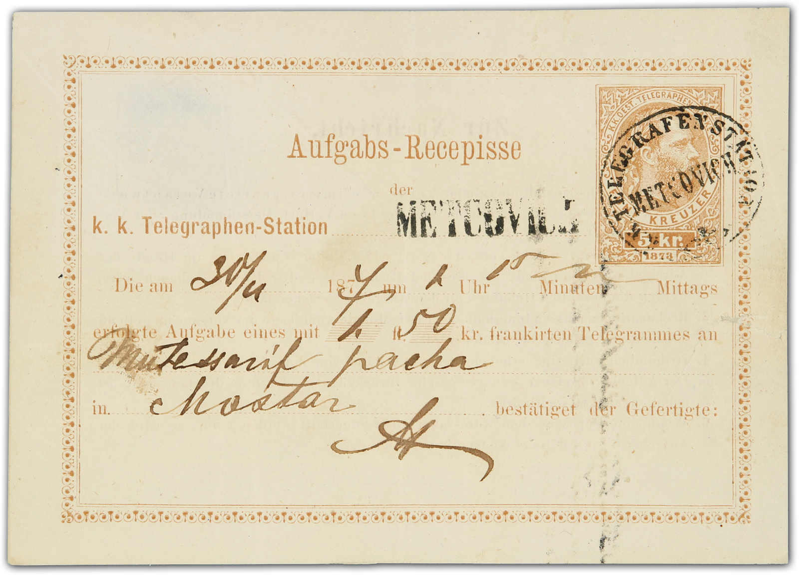 5061 Brief imageMetkoviç-Metcovich: 1877, telegram postal stationery receipt form for 5 kr. in brown in thin white stock, used to Mostar with good strike of oval framed "K.K.Telegrafen Station / METCOVICH" handstamp in black, with Office straight line "METCOVICH" handstamp alongside (Image) (imagea)