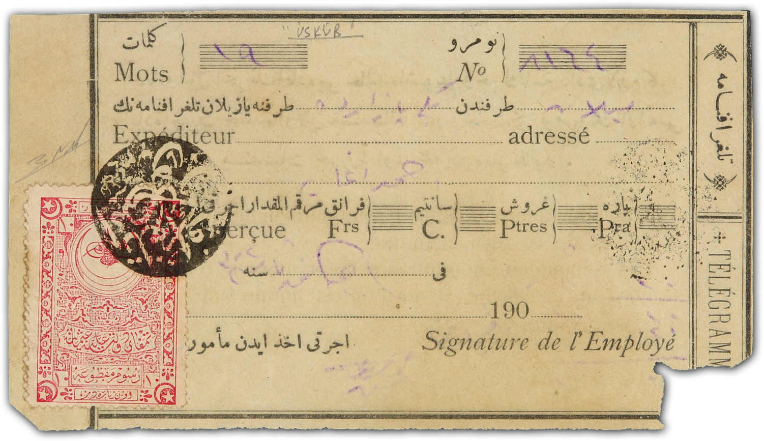 5063 Brief imageSkopje-Üsküp: 1886, telegram receipt bearing 10 para stamp tied by all Arabic negative "TELEGRAF ÜSKÜP" (="TELEGRAM SKOPIE") seal, unrecorded type, signed Nakri (Image) (imagea)
