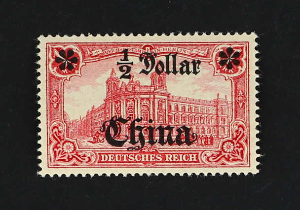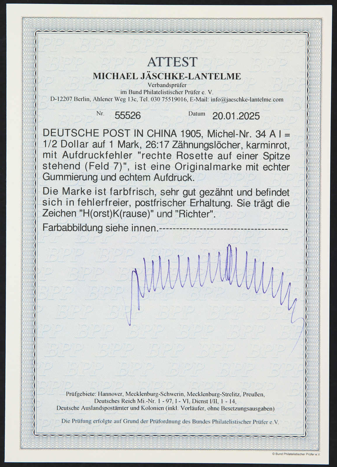 1905, ½ D. auf 1 M. Aufdruckausgabe karminrot, 26:17 Zähnungslöcher, mit Aufdruckfehler "rechte Rosette auf einer Spitze stehend", postfrisch, einwandfrei, signiert, Fotoattest Jäschke-Lantelme BPP 01/2025 (ME 600,-) (Image) (imagea)