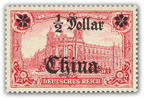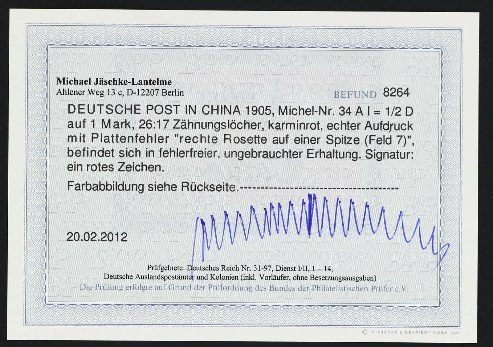 1905, ½ D. auf 1 M. Aufdruckausgabe karminrot, 26:17 Zähnungslöcher, mit Plattenfehler "rechte Rosette auf einer Spitze", ungebraucht, einwandfrei, signiert, Fotobefund Jäschke-Lantelme BPP (ME 300,-) (Image) (imagea)