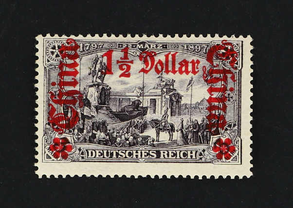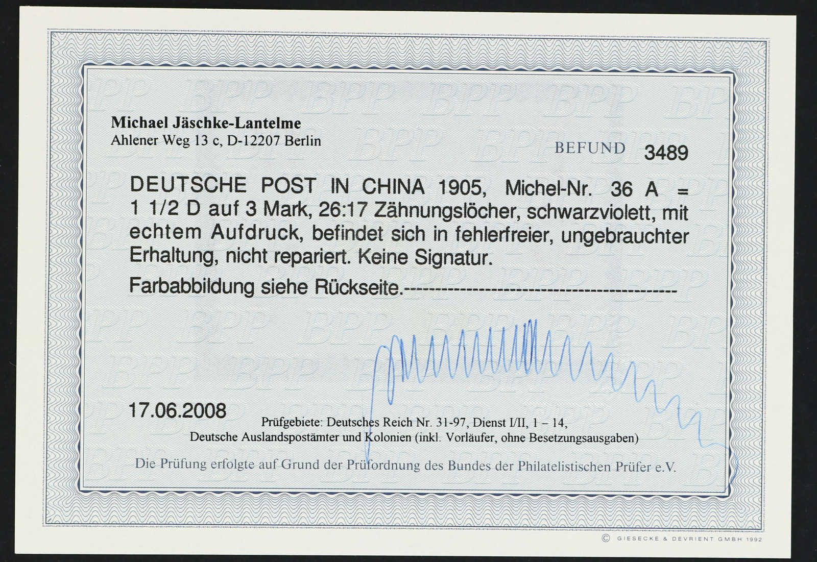 1905, 1½ D. auf 3 M. Aufdruckausgabe schwarzviolett, 26:17 Zähnungslöcher, ungebraucht, einwandfrei, Fotobefund Jäschke-Lantelme BPP (ME 340,-)