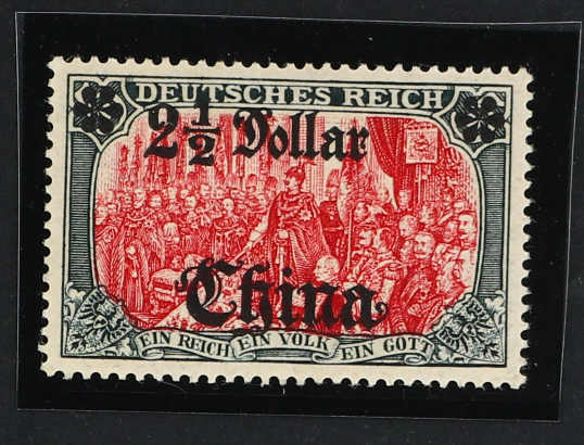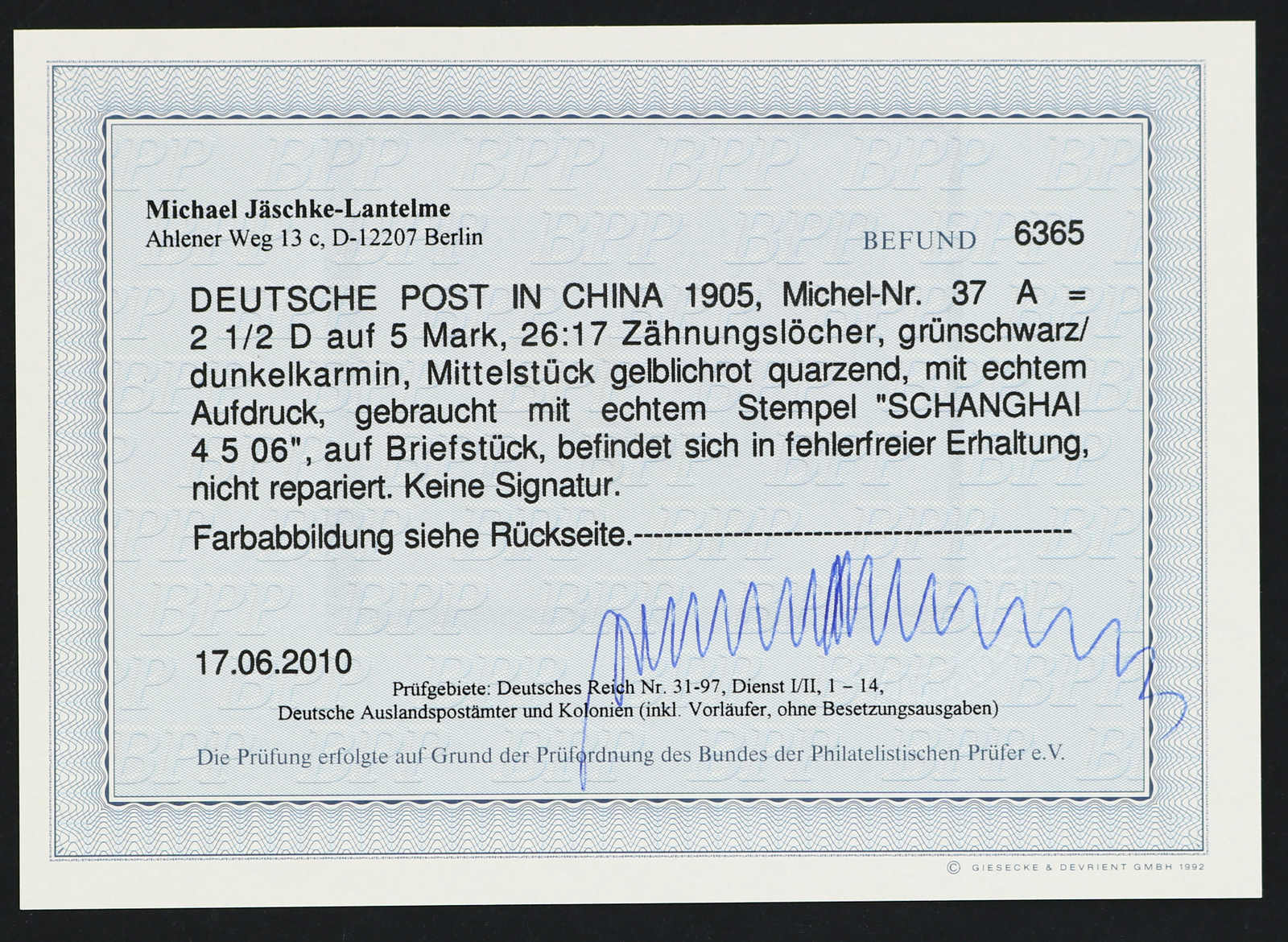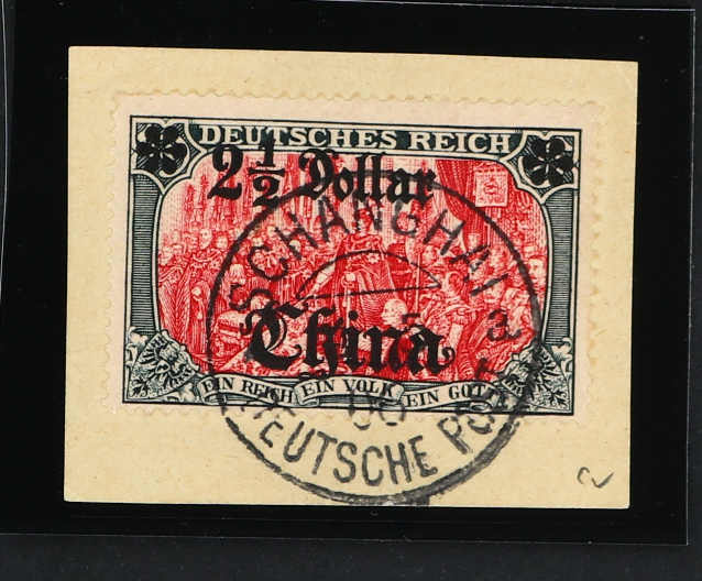 1905, 2½ D. auf 5 M. Aufdruckausgabe grünschwarz/dunkelkarmin, Mittelstück gelblichrot quarzend, 26:17 Zähnungslöcher, glasklar zentrisch entwertet "SCHANGHAI 4 5 06" auf dekorativem Briefstück, einwandfrei, Fotobefund Jäschke-Lantelme