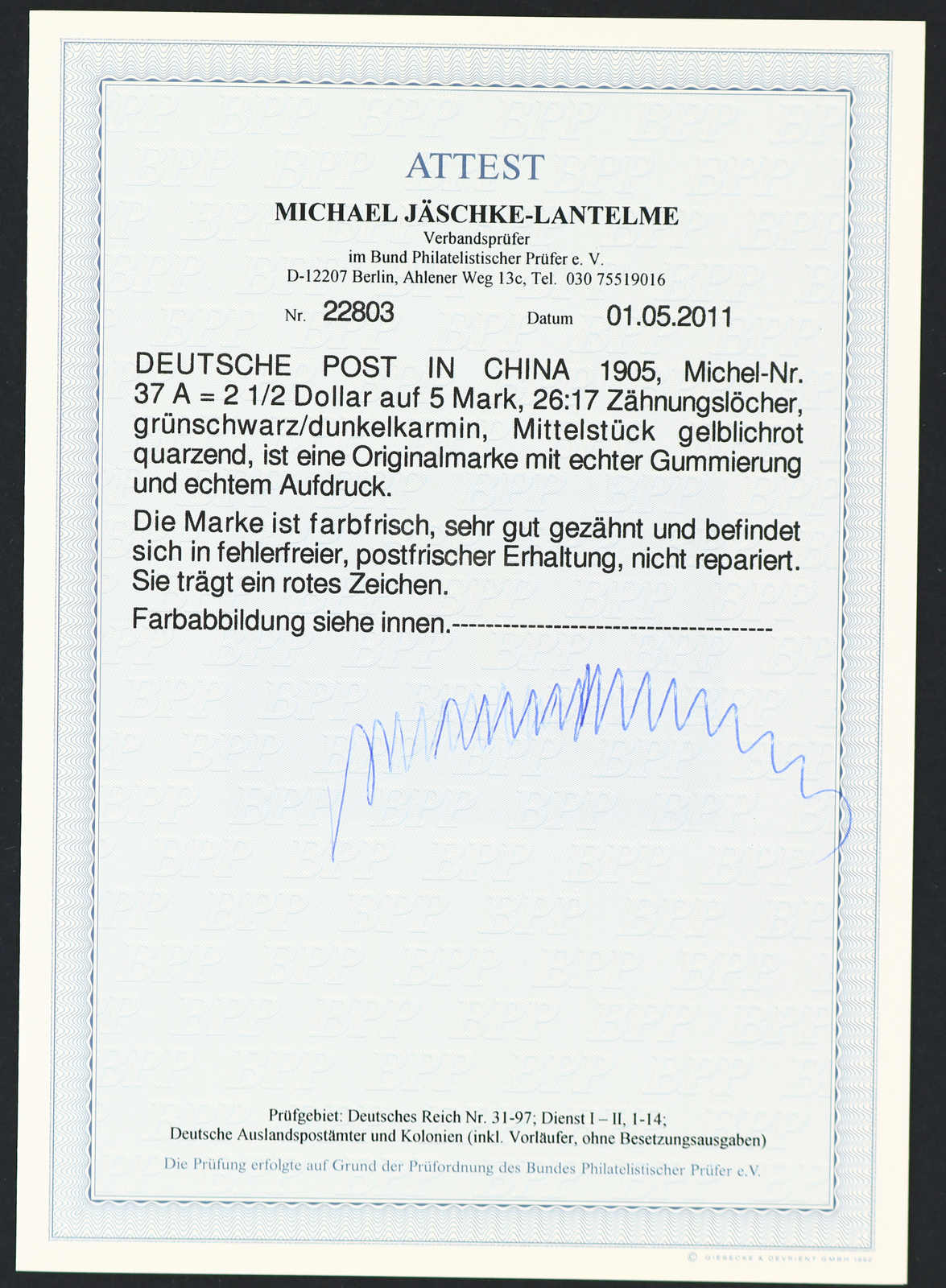 1905, 2 D. auf 5 M. Aufdruckausgabe grünschwarz/dunkelkarmin, Mittelstück gelblichrot quarzend, 26:17 Zähnungslöcher, postfrisch, einwandfrei, signiert, Fotoattest Jäschke-Lantelme BPP (ME 450,-) (Image) (imagea)