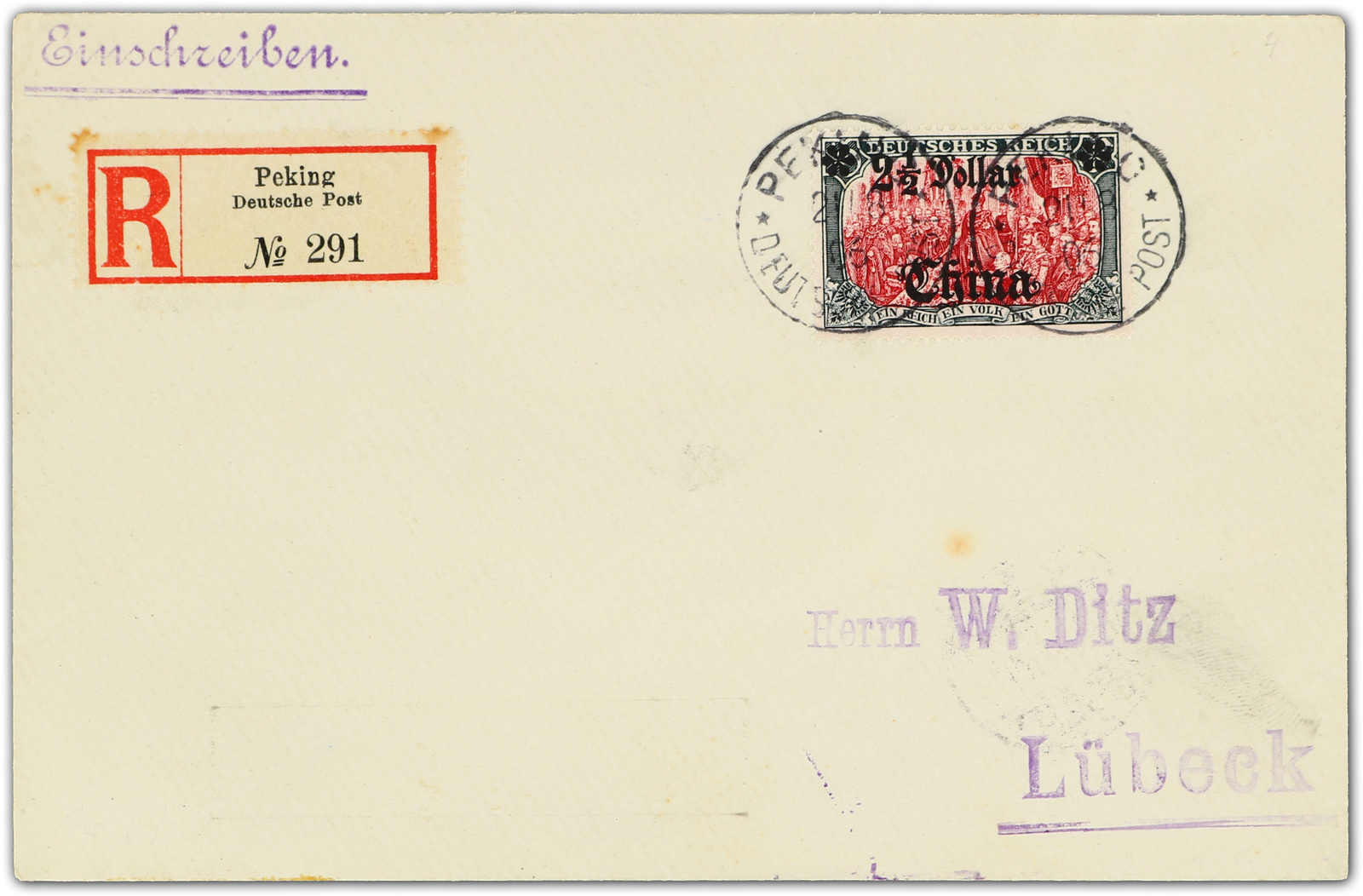 1905, 2½ D. auf 5 M. grünschwarz/dunkelkarmin, Einzelfrankatur auf Sammler-R-Brief, aufgegeben "PEKING DEUTSCHE POST 21/8 06", adressiert nach Lübeck, rückseitig Ankunftsstp. vom 4.10.06, Umschlag minimal gebräunt, sonst einwandfrei,