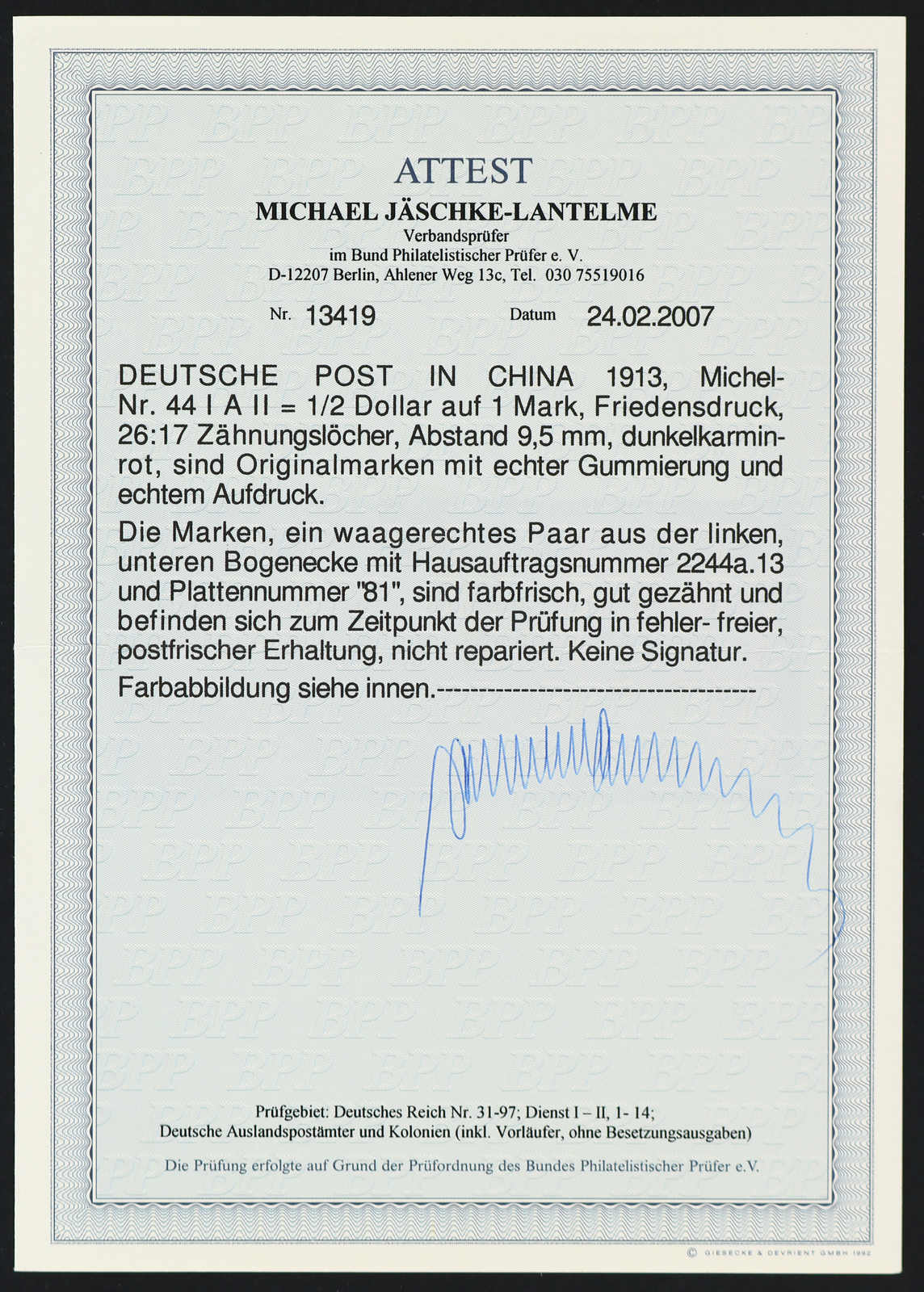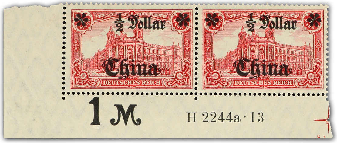 1913, ½ D. auf 1 M. Aufdruckausgabe dunkelkarminrot, Friedensdruck, 26:17 Zähnungslöcher, Abstand 9,5 mm, waagerechtes Paar aus der unteren linken Bogenecke mit HAN 2244a.13 und Plattennummer 81, postfrisch in einwandfreier Qualität,