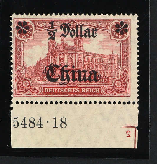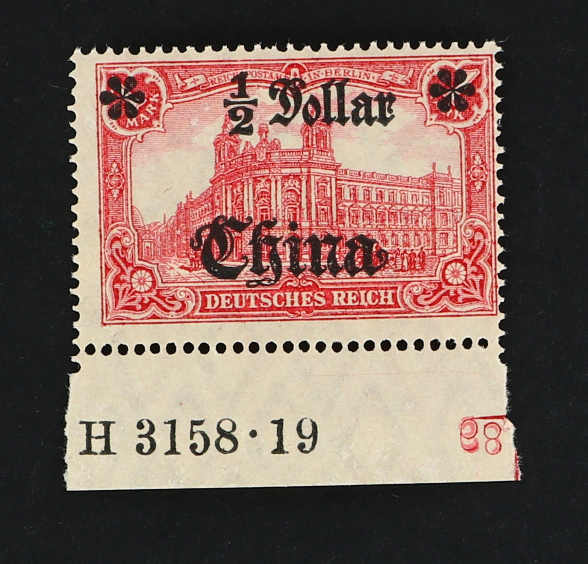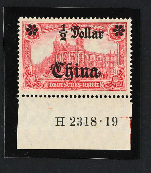 1919, ½ D. auf 1 M. Aufdruckausgabe karminrot, Kriegsdruck, 25:17 Zähnungslöcher, Wertaufdruck nach rechts, postfrisches Exemplar vom Unterrand mit HAN 2318.19, leichte Haftstellen im Unterrand, sonst einwandfrei, unsigniert, Fotobefund