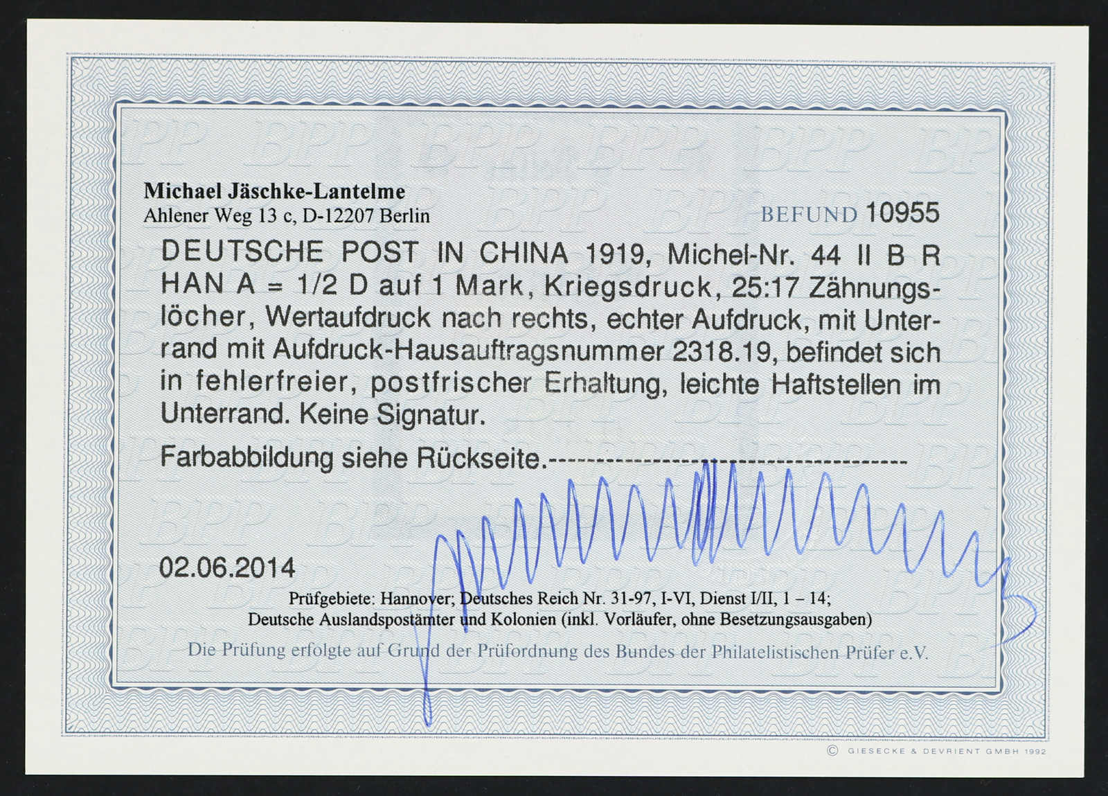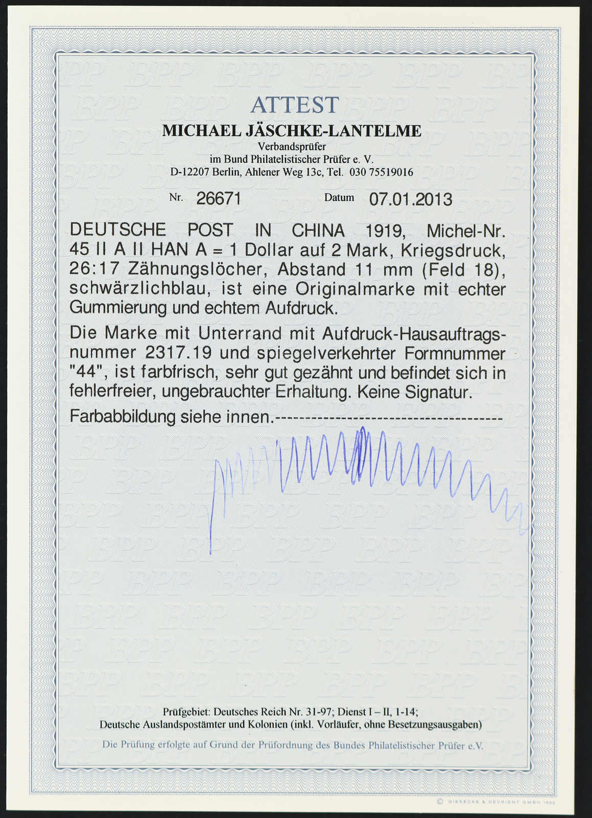 1919, 1 D. auf 2 M. Aufdruckausgabe schwärzlichblau, Kriegsdruck, 26;17 Zähnungslöcher, Abstand 11 mm, ungebrauchtes Exemplar vom Unterrand mit Aufdruck-HAN 2317.19 und spiegelverkehrter Formnummer "44", farbfrisch, einwandfrei,