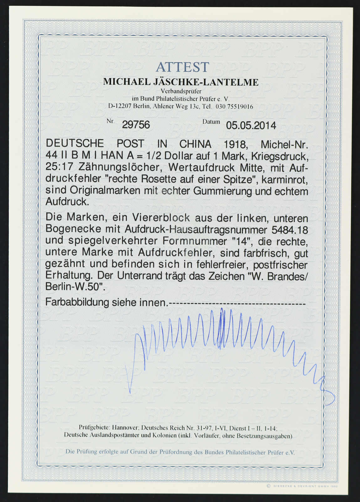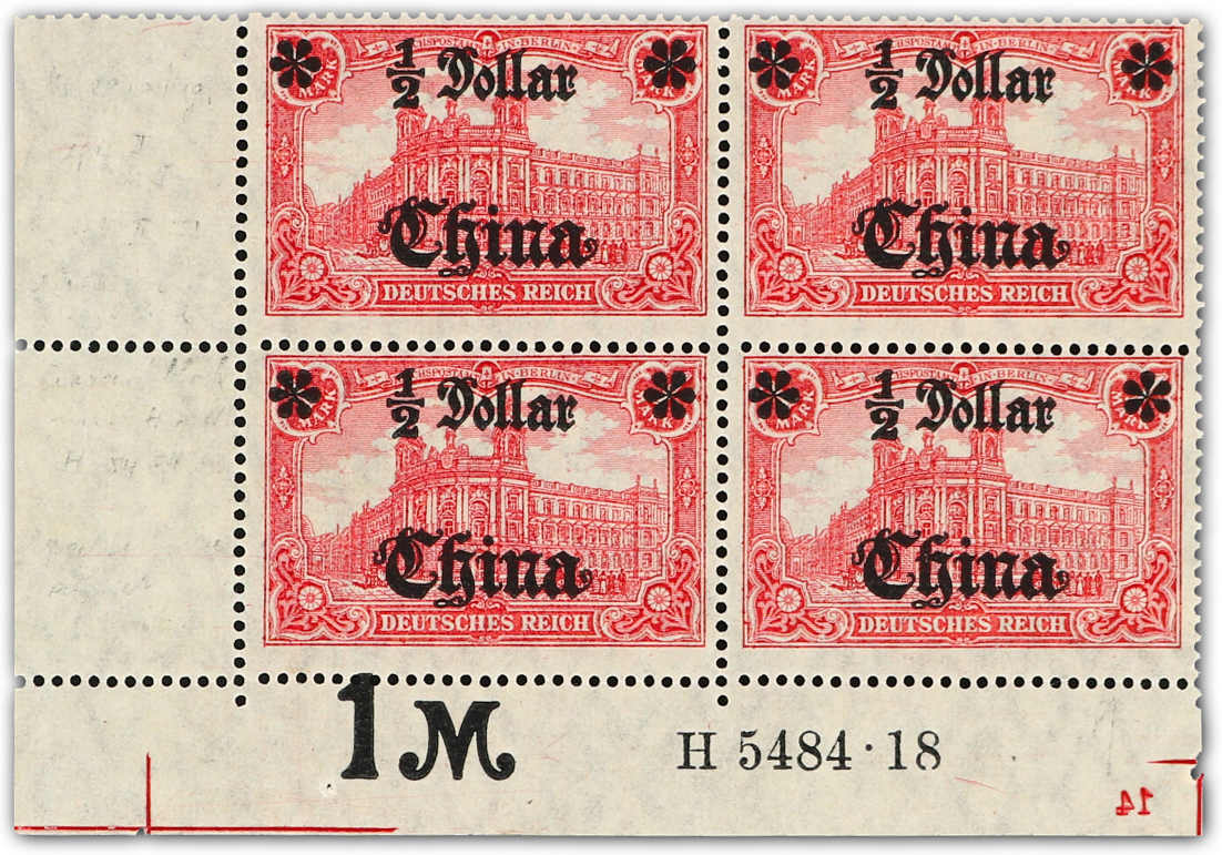 1918, ½ D. auf 1 M. Aufdruckausgabe karminrot, Kriegsdruck, 25:17 Zähnungslöcher, Wertaufdruck Mitte, mit Aufdruckfehler "rechte Rosette auf einer Spitze", Viererblock aus der linken unteren Bogenecke mit Aufdruck-HAN 5484.18 und