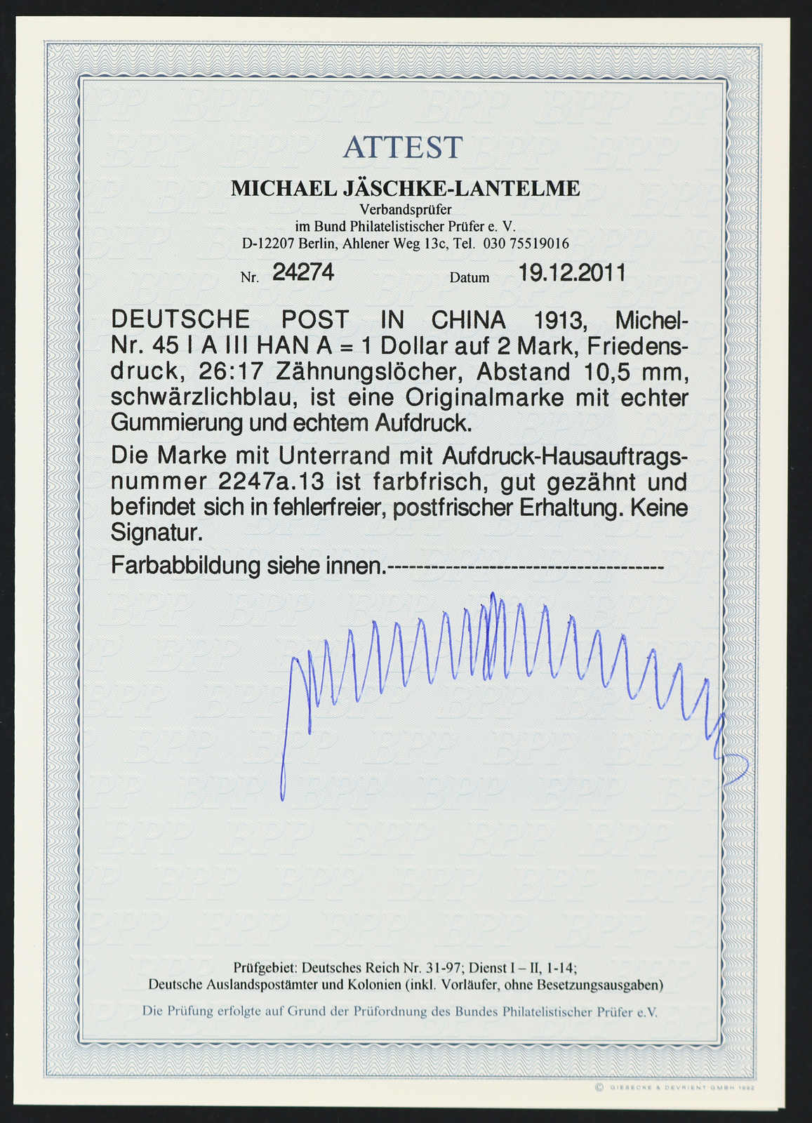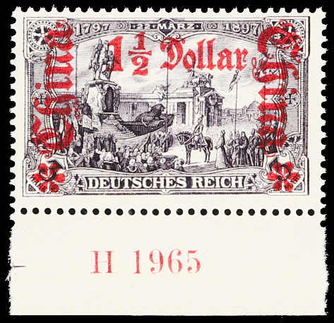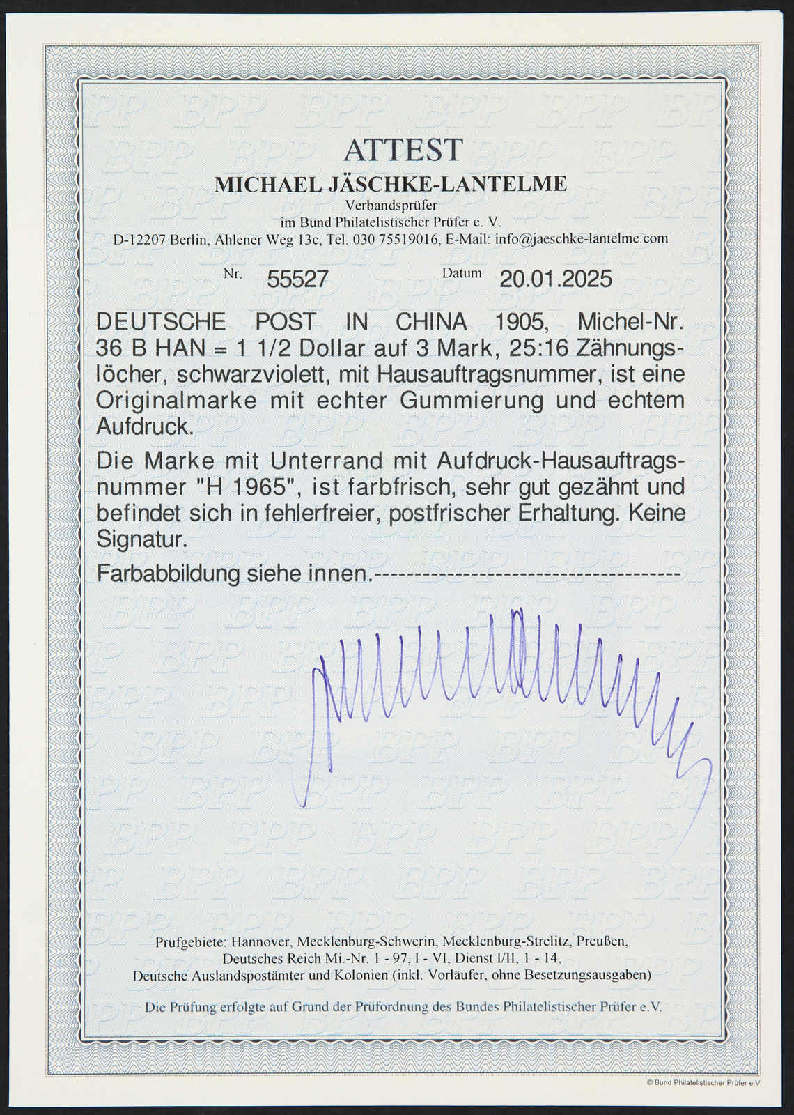 1905, 1½ D. auf 3 M. Aufdruckausgabe schwarzviolett, 25:16 Zähnungslöcher, postfrisches Exemplar vom Unterrand mit Aufdruck-HAN "H 1965", einwandfrei, unsigniert, Fotoattest Jäschke-Lantelme BPP 01/2025 (ME 500,-) (Image) (imagea)