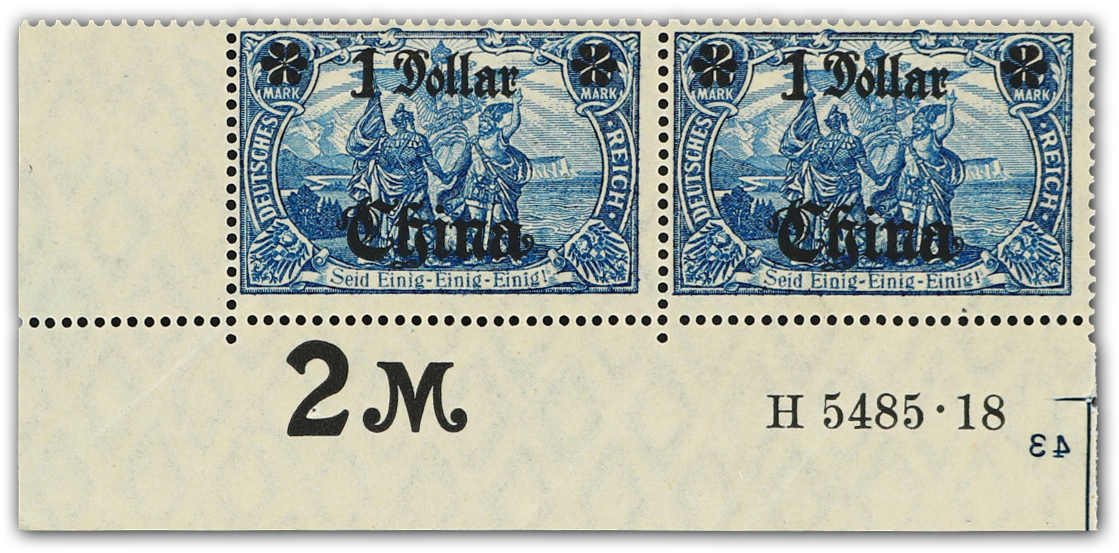 1919, 1 D. a. 2 M. schwärzlichblau, postfrisches waagerechtes Paar aus der linken unteren Bogenecke mit der HAN 5485.18 und spiegelverkehrter Formnummer 43, farbfrisch und gut gezähnt, einwandfrei (ME 515,-) (Image)