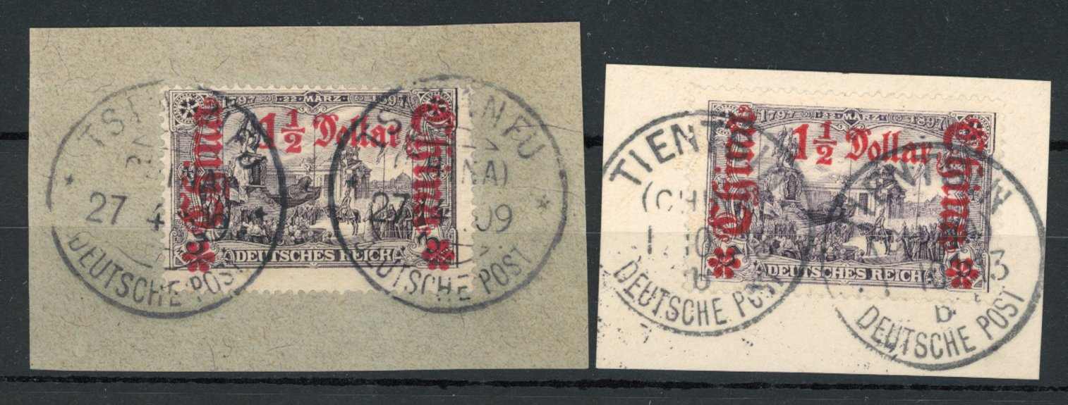 1905, 1½ D. auf 3 M., 2 Einzelwerte, je auf Briefstück, in den zwei verschiedenen Zähnungen, beide Werte gest. "TIENTSIN DEUTSCHE POST" mit Daten aus 1909 und 1913, farbfrisch und gut gezähnt, einwandfrei, je sign. Bothe BPP (Image)