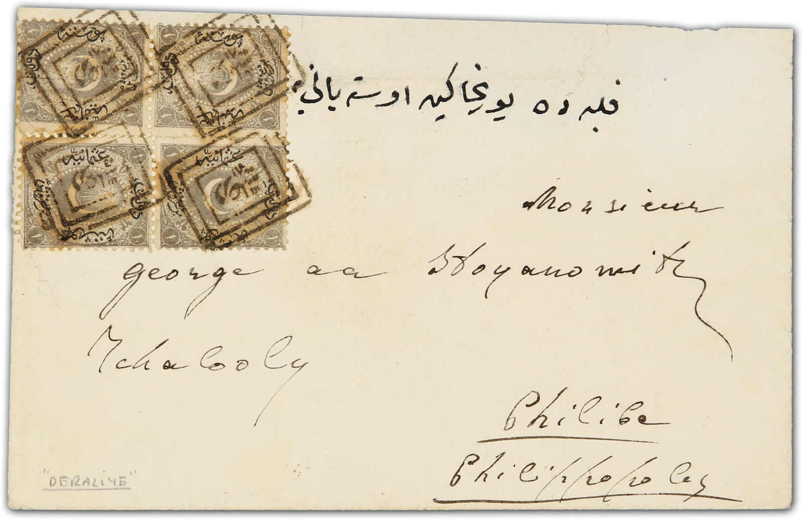 Plovdiv-Filibe: 1865, cover from Constantinople to Plovdiv bearing Duloz 1865 issue 1 piastre grey two pairs tied by fine strikes of Arabic triple-box "Deraliye 81" handstamps in black (Coles & Walker fig. 18), small part of the flap
