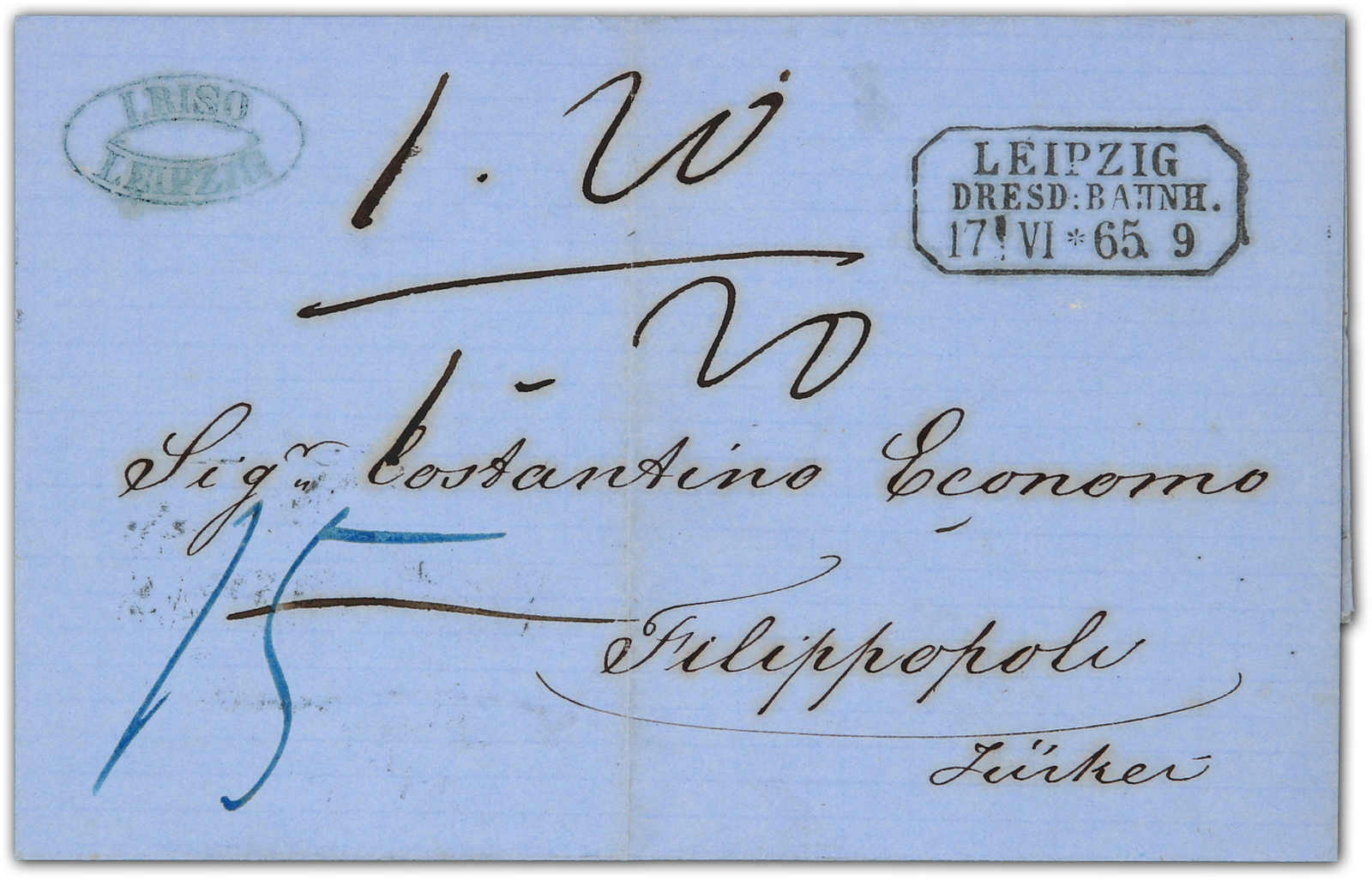 Plovdiv-Filibe: 1865, entire letter sent from Leipzig/Germany by Dresden Bahnhof (railway post) to Filippopoli showing 15 and 1.20 tax manuscript markings, on reverse Vienna transit postmark (Image) (imagea)