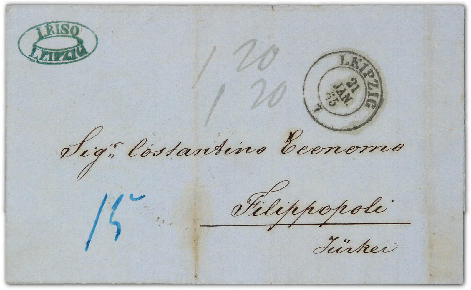 Plovdiv-Filibe: 1865, entire letter sent from Leipzig/Germany to Filippopoli showing 15 and 1.20 tax manuscript markings, on reverse Vienna transit postmark (Image) (imagea)
