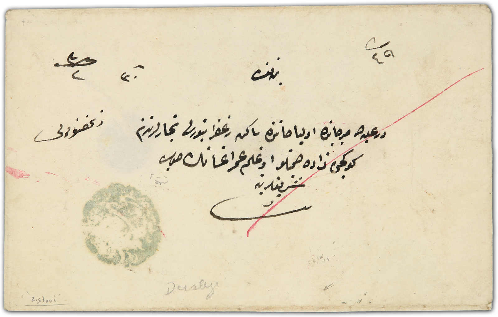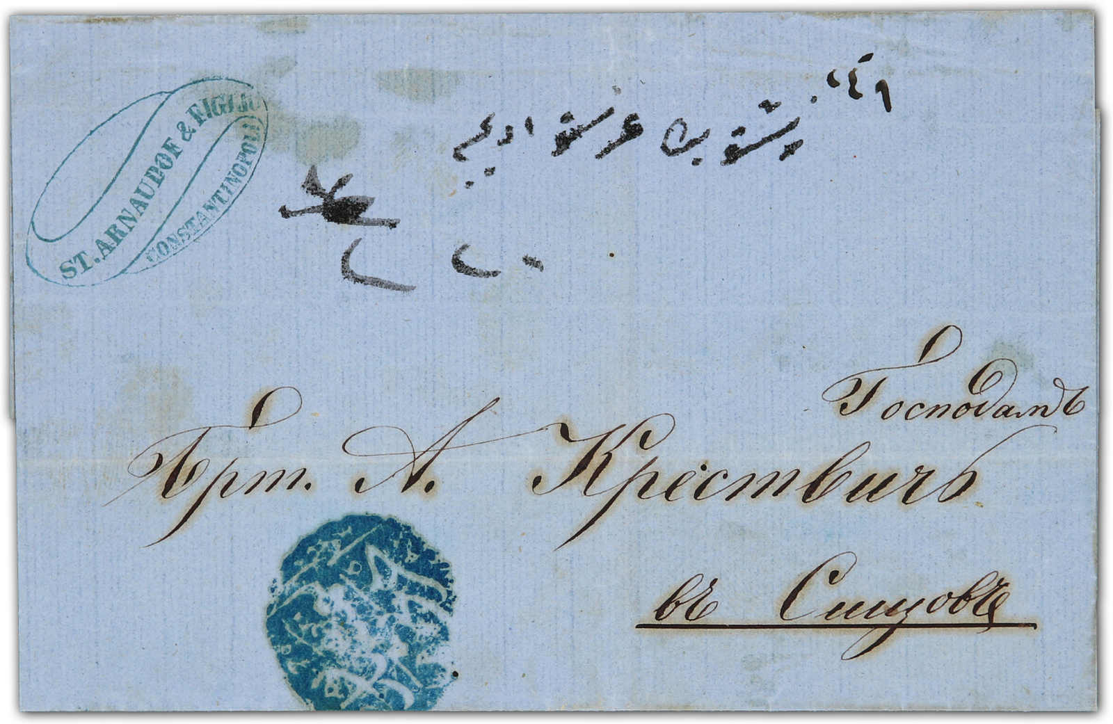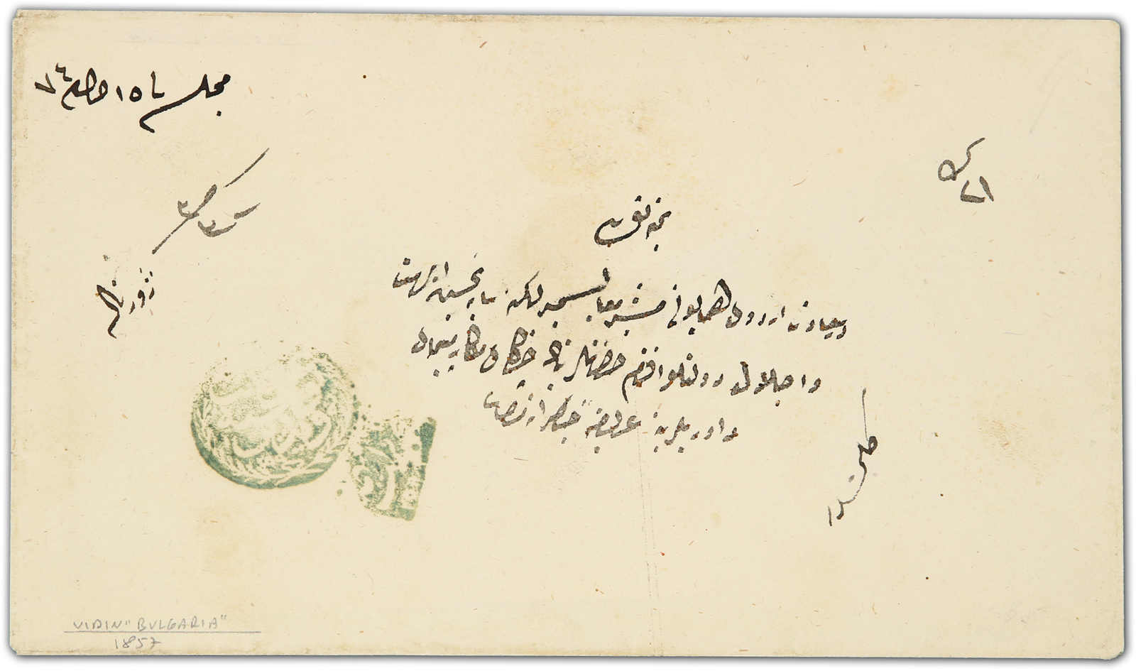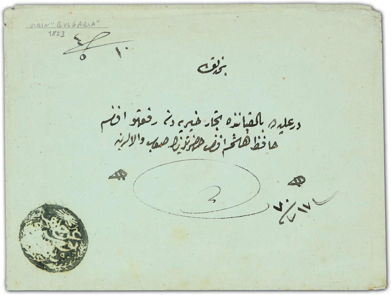Svishtov-Ziştovi: pre-philatelic cover from Ziştovi to Constantinople (Ottoman mail from Ziştovi at early date was cancelled at the arrival office) struck with fair Arabic negative "An Canib Posta-i Deraliyye 257" black seal (Coles &