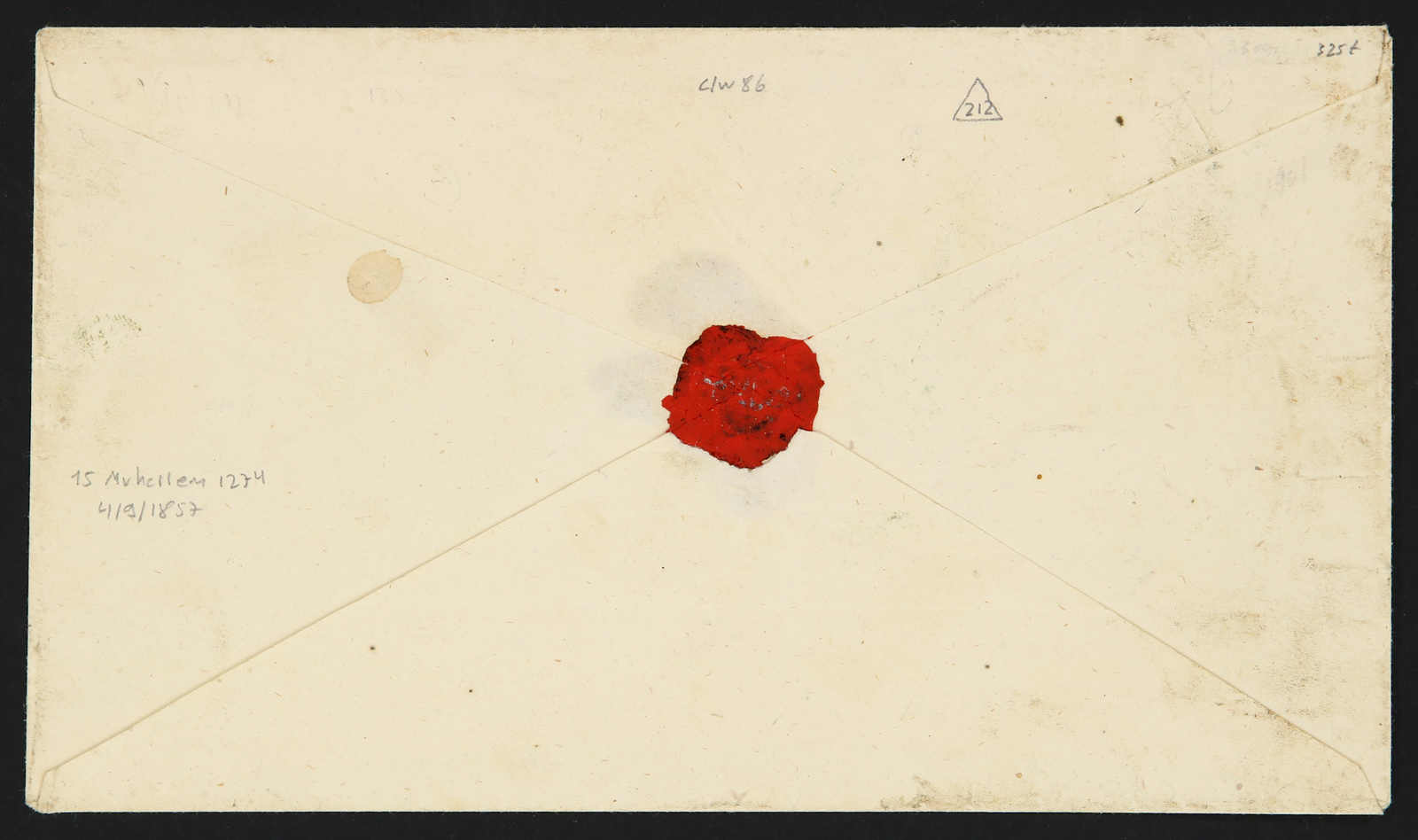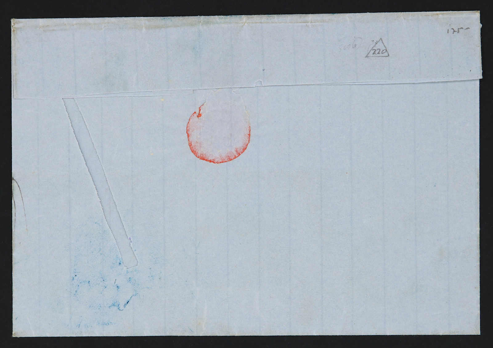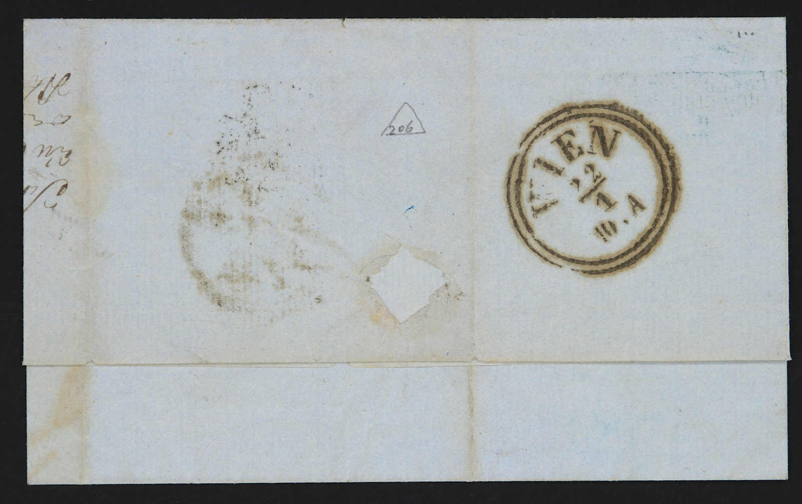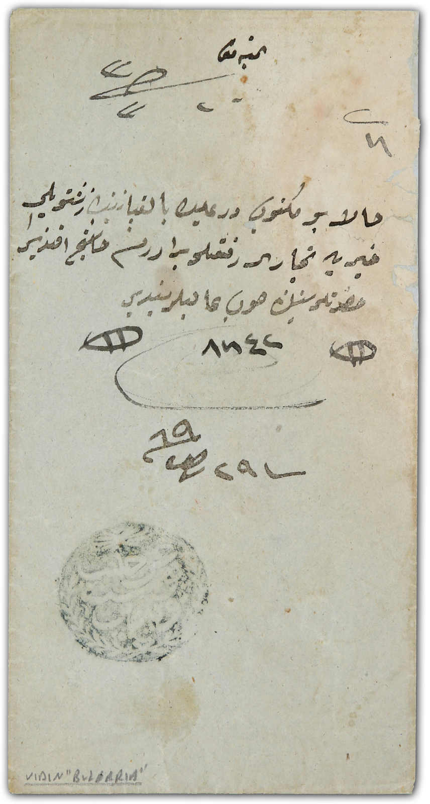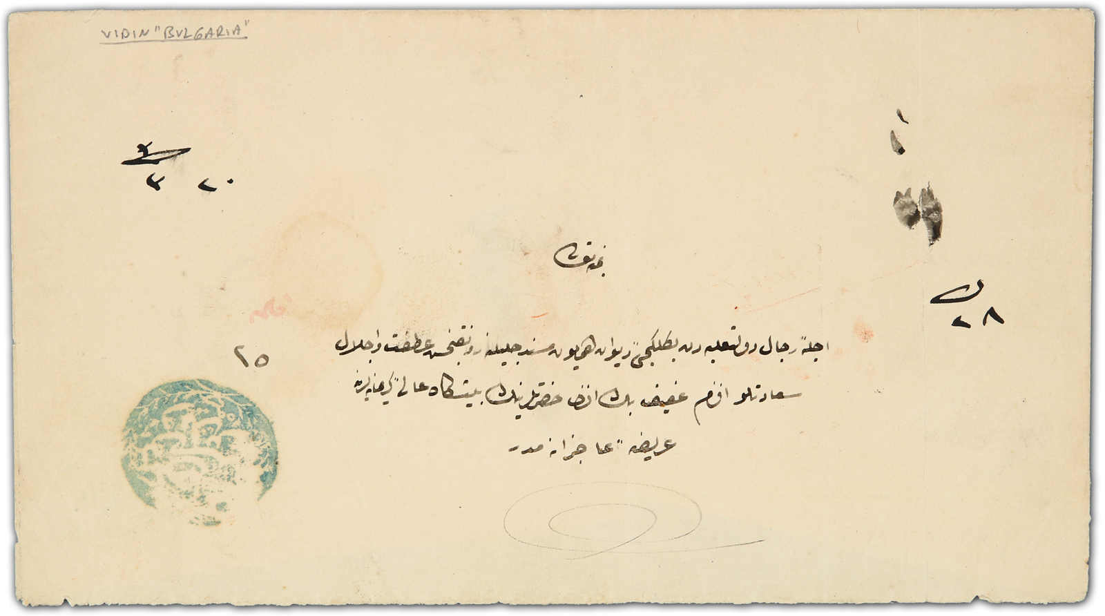 Svishtov-Ziştovi: pre-philatelic cover from Ziştovi to Constantinople (Ottoman mail from Ziştovi at early date was cancelled at the arrival office) struck with fair Arabic negative "An Canib Posta-i Deraliyye 257" black seal (Coles &