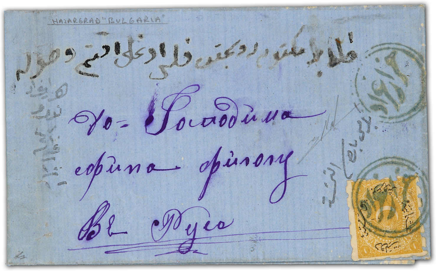 Razgrad - Hazargrad: 1874, entire letter from Razgrad to Ruse bearing 1869/71 Duloz 1 pi. yellow tied by extremely fine and rare Arabic double-circle "Hazargrad" handstamp in green (Coles & Walker fig. 22) with further strike above as the