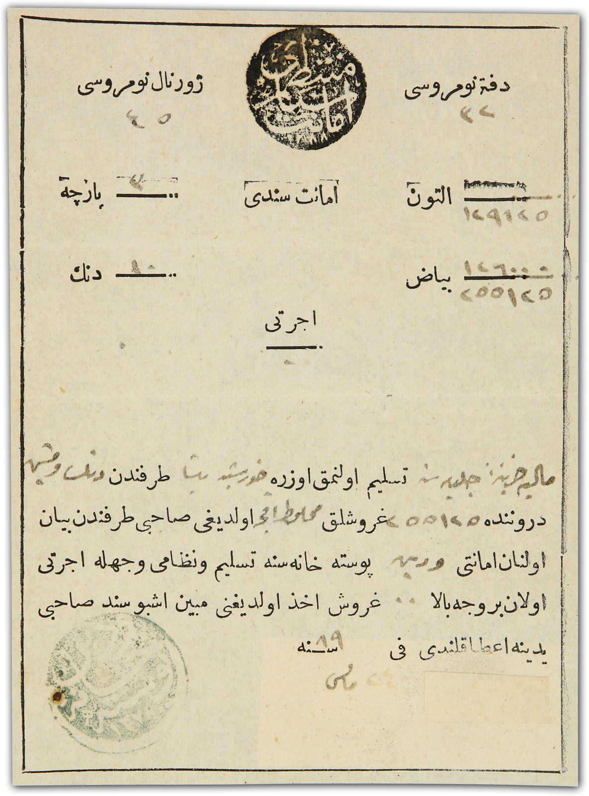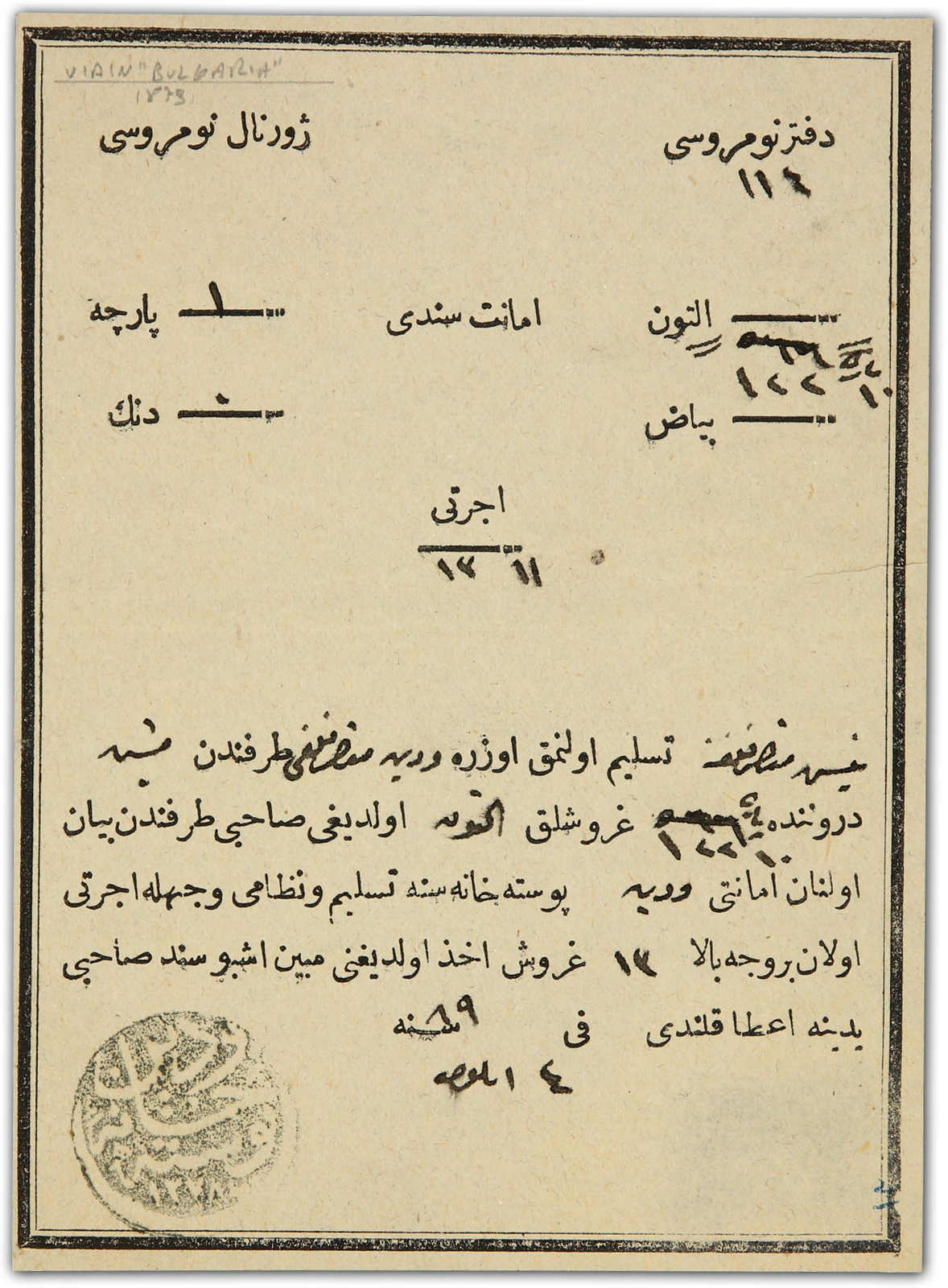 Arabic negative with Crescent type "Postahane-i Vidin 1278" ( Post Office Vidin 1861) handstamp in greenish black (Coles & Walker fig. 87), on top of the form also showing extremely rare all Arabic negative "Emanet-i Muntazıri Seyyar" seal (Bayindir