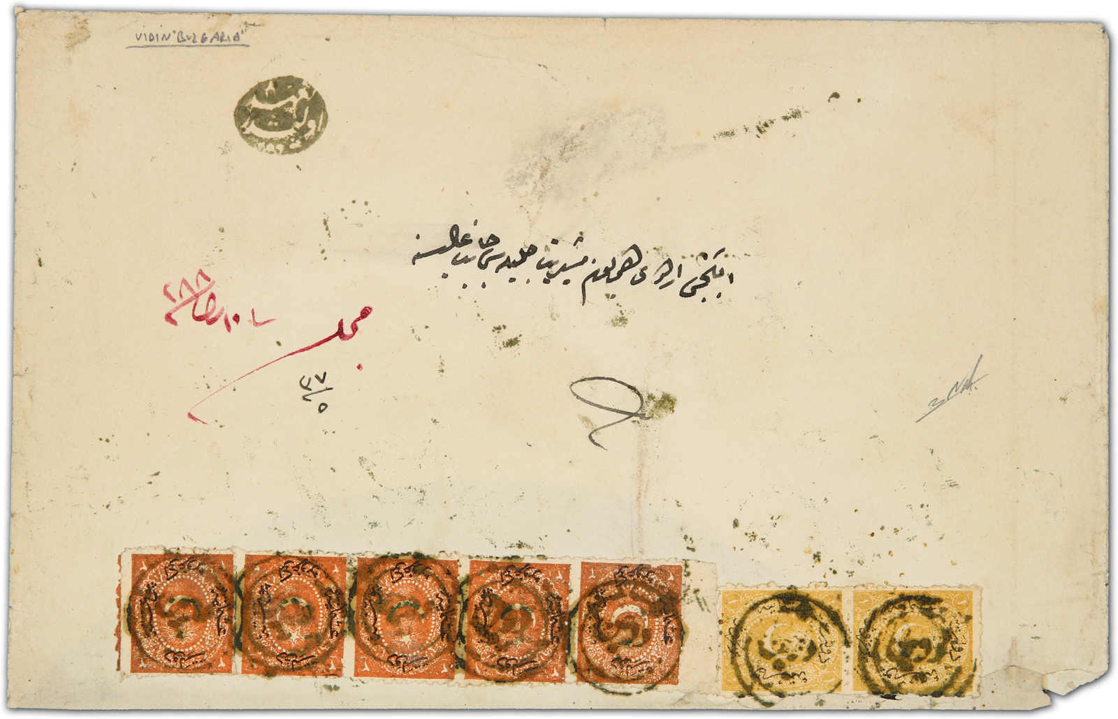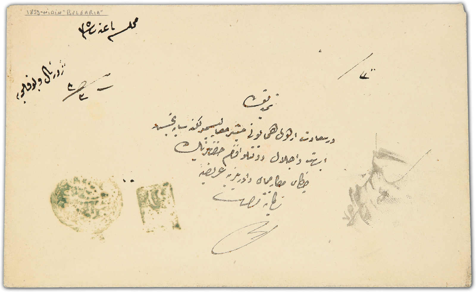 Vidin: 1859, official cover from Vidin to Constantinople with fine strike of all Arabic negative "An Canib-i Posta-i Vidin 259" handstamp in greenish black (Coles & Walker fig. 86), alongside boxed negative "Tahrirat-# Mühimme"