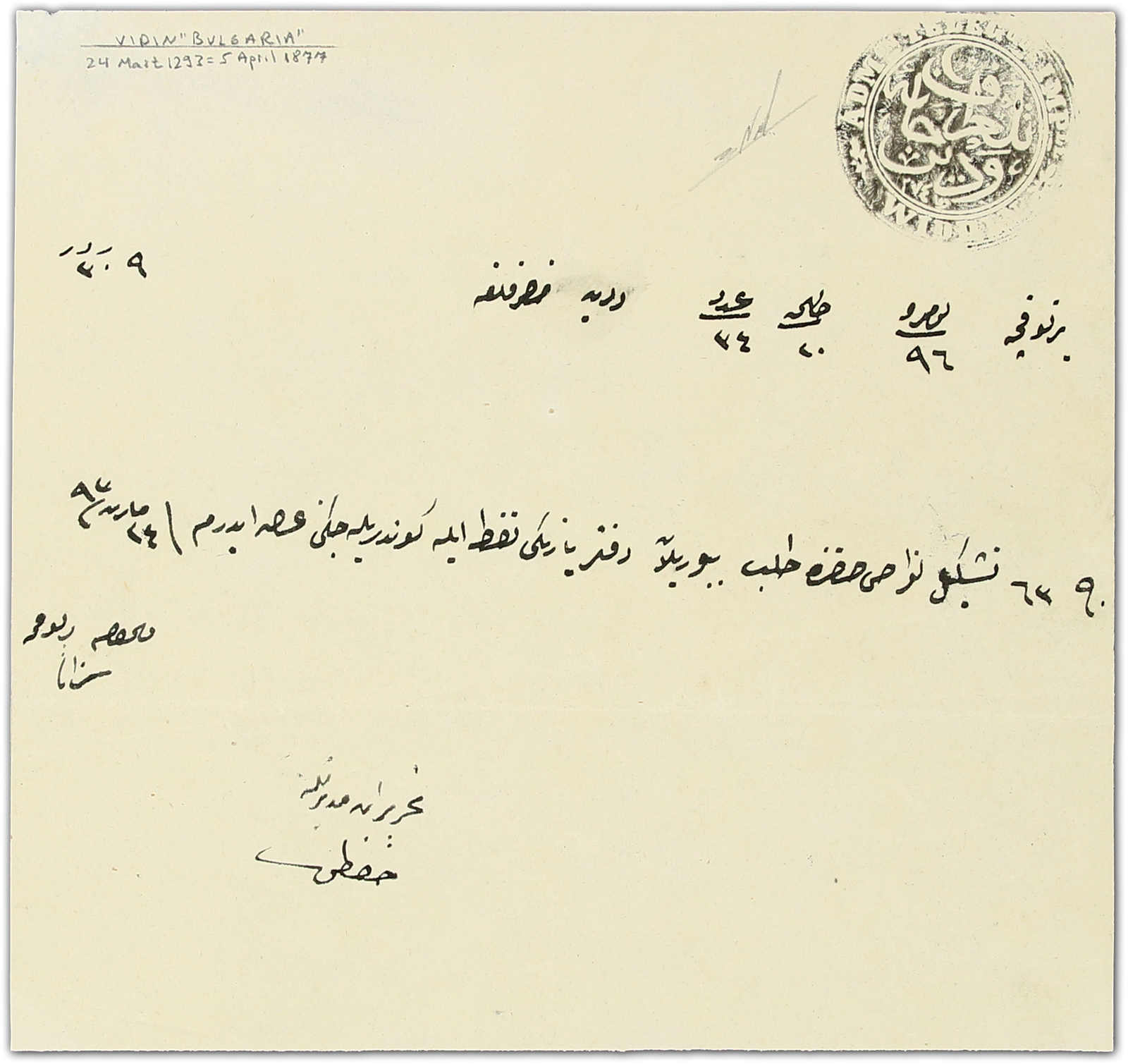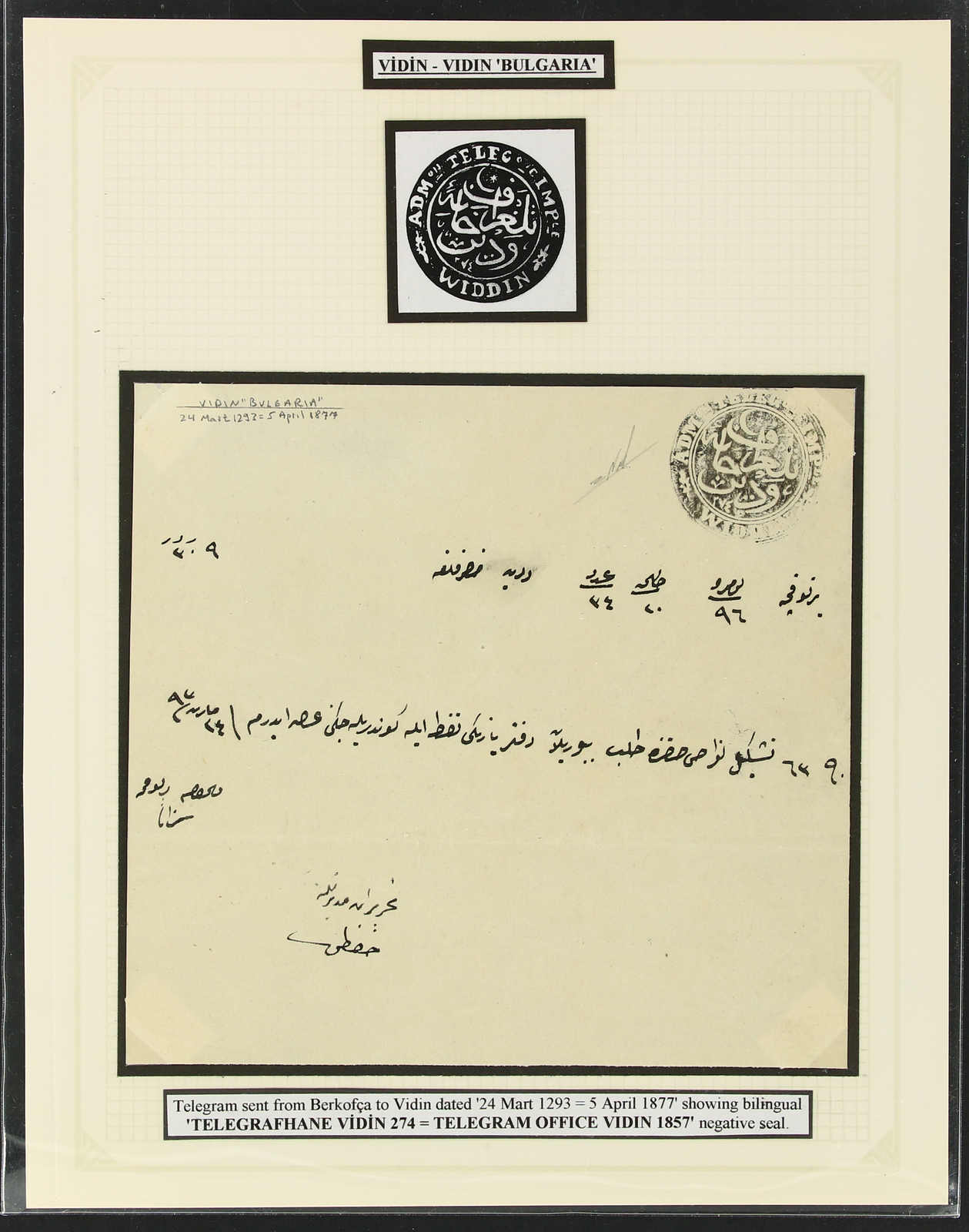 Vidin: 1877, telegram sent from Befkofça to Vidin dated "24 Mart 1293" (="5 April 1877") showing rare bilingual negative "ADMon TELEGque IMPle WIDDIN" (="TELEGRAFHANE-I VIDIN 274") handstamp in black (Isfila AP06), signed Nakri (Image) (imagea)