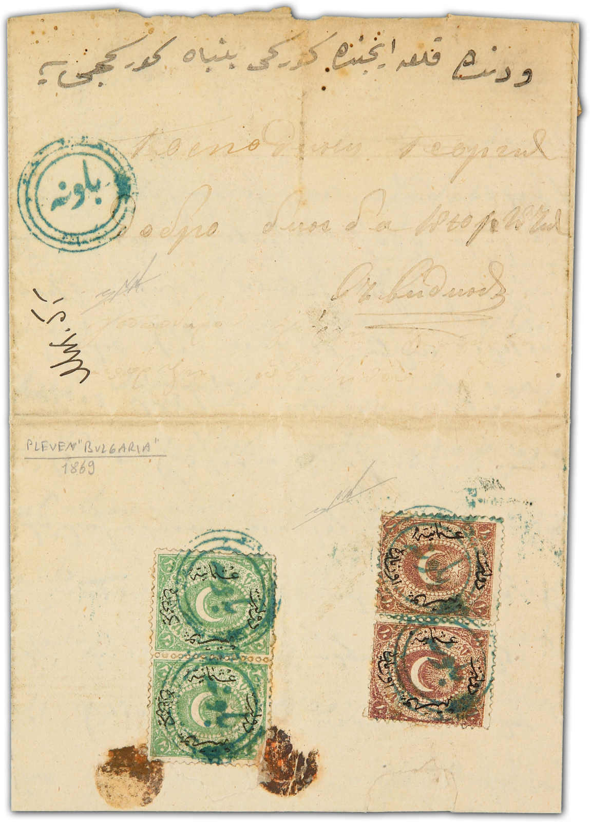 Plevne-Pleven: 1869, entire letter from Pleven to Vidin bearing on reverse two pairs of Duloz stamps 1868 issue 10 para rose-lilac and 20 para green tied by extremely rare Superb all Arabic triple-oval "Plevne" postmarks (Coles & Walker