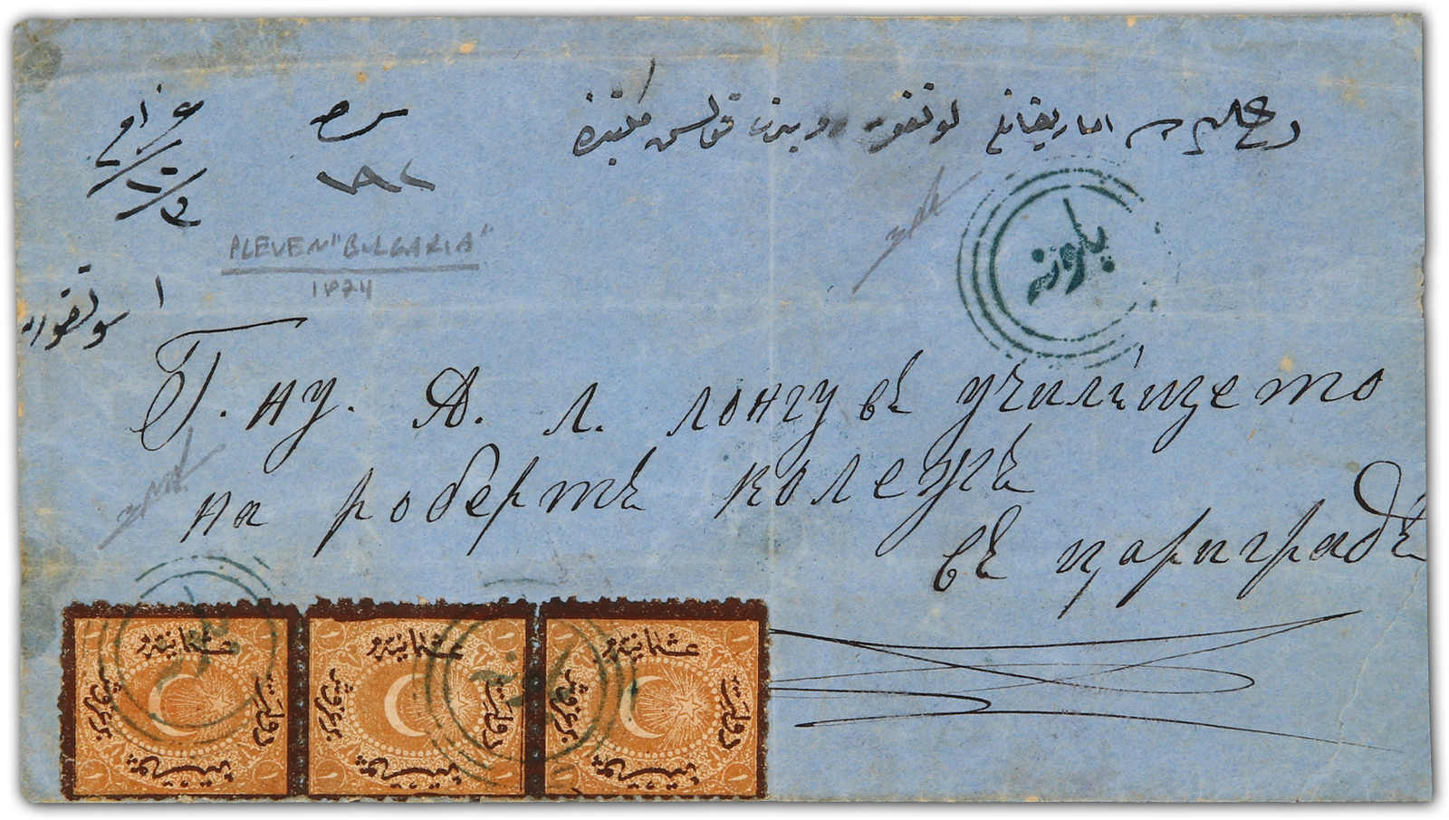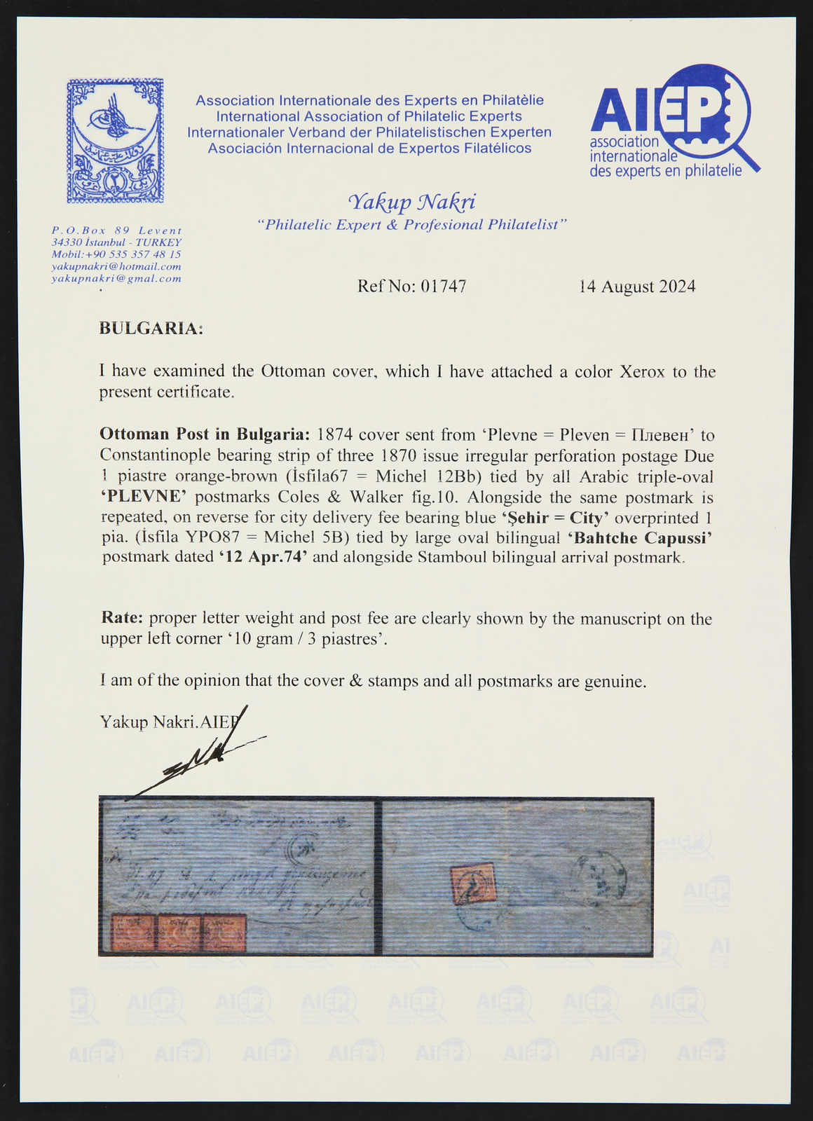 Plevne-Pleven: 1874, cover sent from Pleven to Constantinople bearing strip of three 1870 issue irregular perforation postage due stam one piastre orange-brown tied by all Arabic triple-oval "PLEVNE" postmarks (Coles & Walker fig. 10),