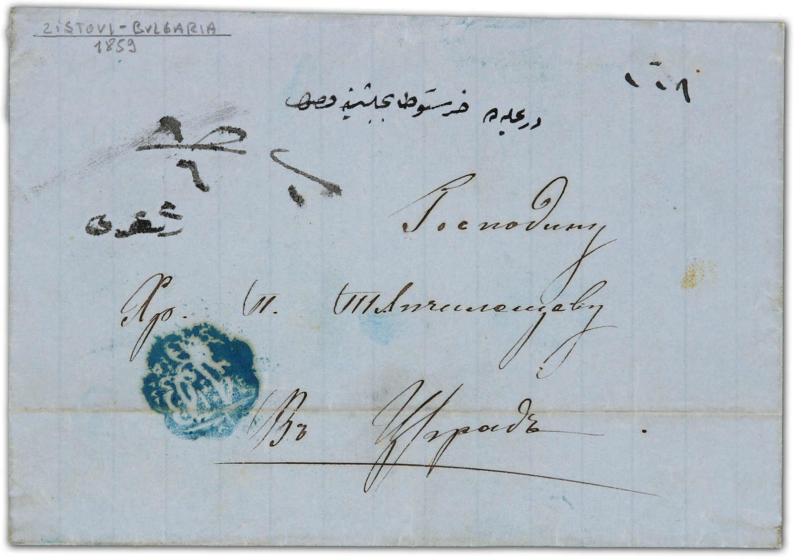 Svishtov-Ziştovi: 1859, prephilatelic entire from Constantinople to Ziştovi showing extremely fine and clear Arabic negative "Ücreti Alinmiştir" (="Fee has been paid") seal in blue (Coles & Walker fig. 14), further Arabic manuscript