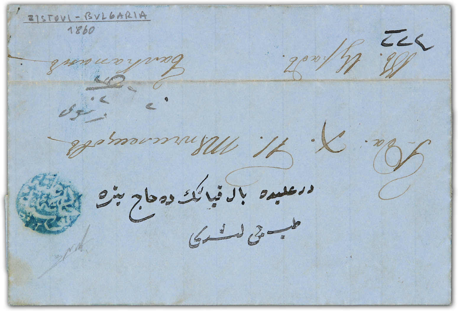 Svishtov - Ziştovi: 1860, entire letter from Ziştovi to Constantinople (Ottoman mail from Ziştovi at this date was cancelled at the arrival office), struck in Constantinople with Arabic negative "Postahane-i Deraliyye 272" handstamp in
