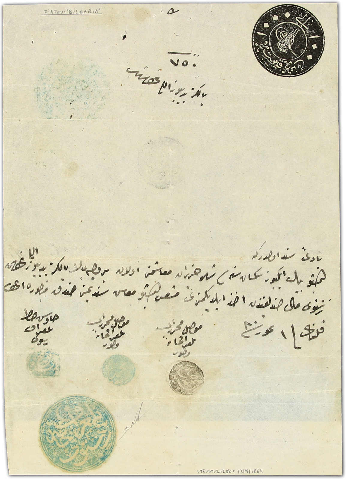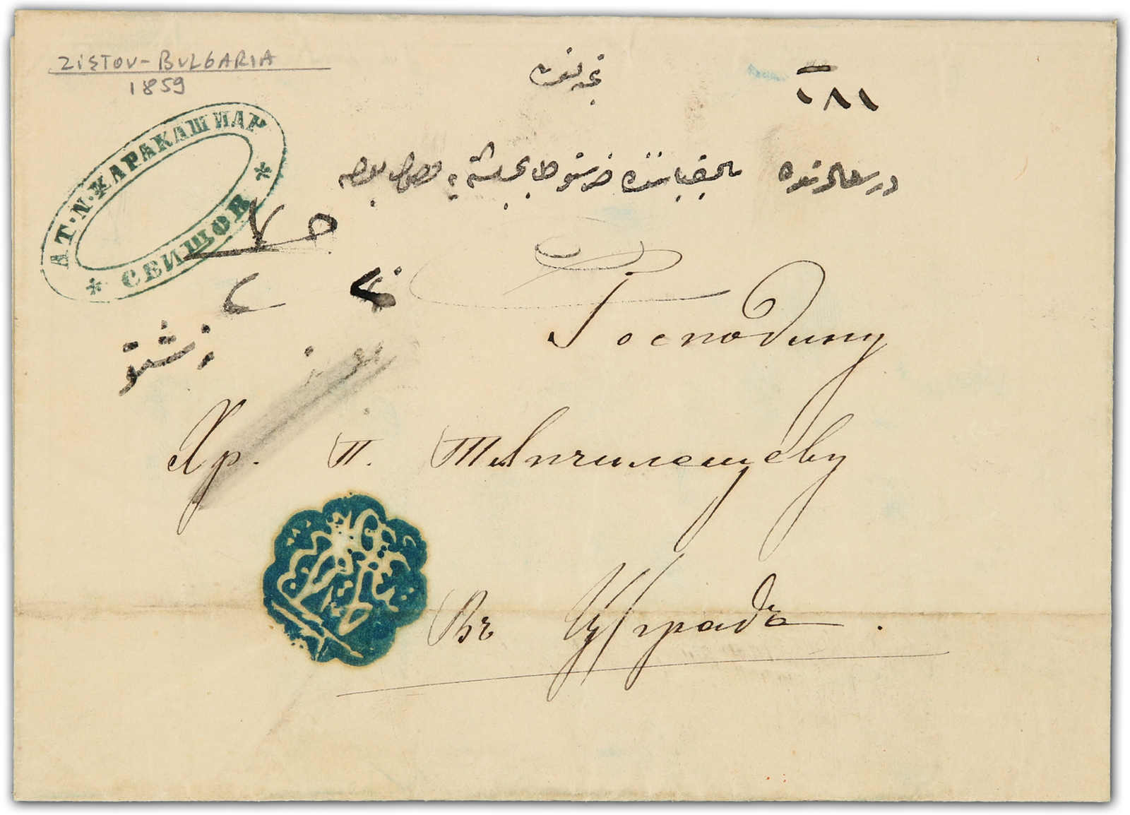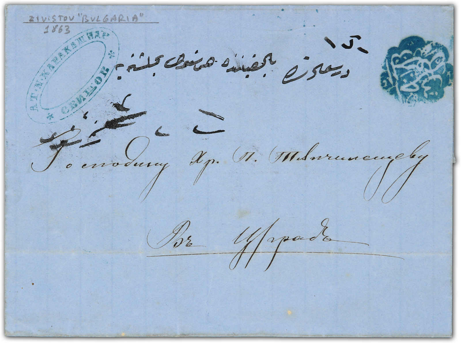 handstamp in blue (Coles & Walker fig. 15) with manuscript "Ziştovi" and weight 3 Dirhem / postal charge 2 piastre 20 paras (Image)