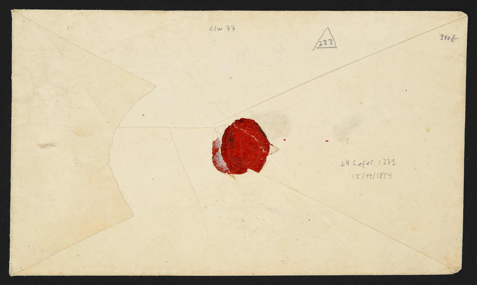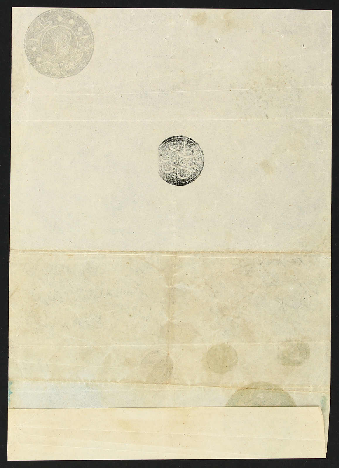 Arabic negative rectangle "Tahrirat-i Mühimme" (Official Correspondence) black seal alongside, weight 4 Dirhem / postal charge 3 piastre 15 paras in manuscript at upper left (Image) (imagea)