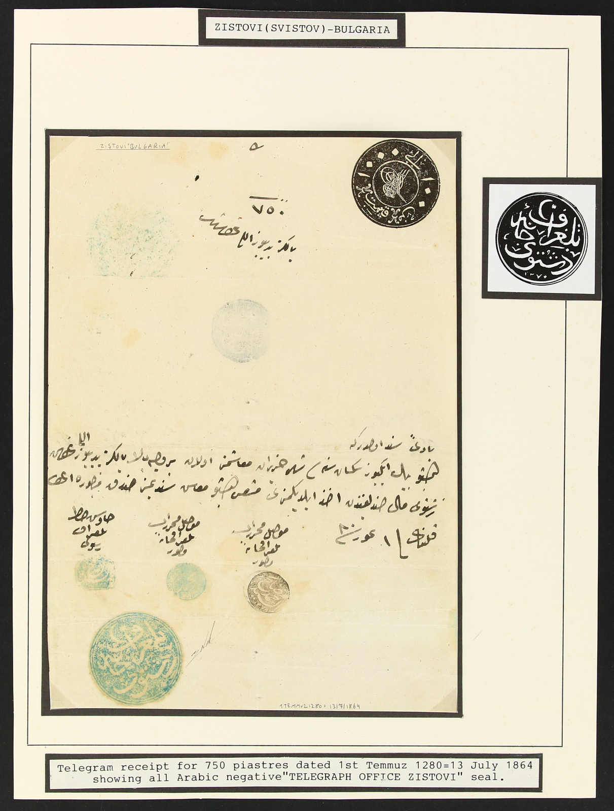 Svishtov-Ziştovi: 1864, telegram receipt form for 750 piastres dated 1 Temmuz 1280 = 13 July 1864 showing extremely rare Arabic negative "Telgrafhane-i Ziştovi 1278" (="Telegraph Office Svishtov 1861") struck in greenish blue (İsfila