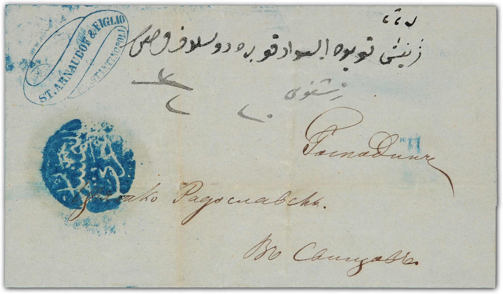 Svishtov-Ziştovi: 1859, cover from Constantinople to Svishtov showing all Arabic large negative strike of "Ücreti Alinmişdir 1274" (="Fee has been collected 1857") handstamp in blue (Coles & Walker fig. 14), "ST.ARNAUDOF & FIGLIO /