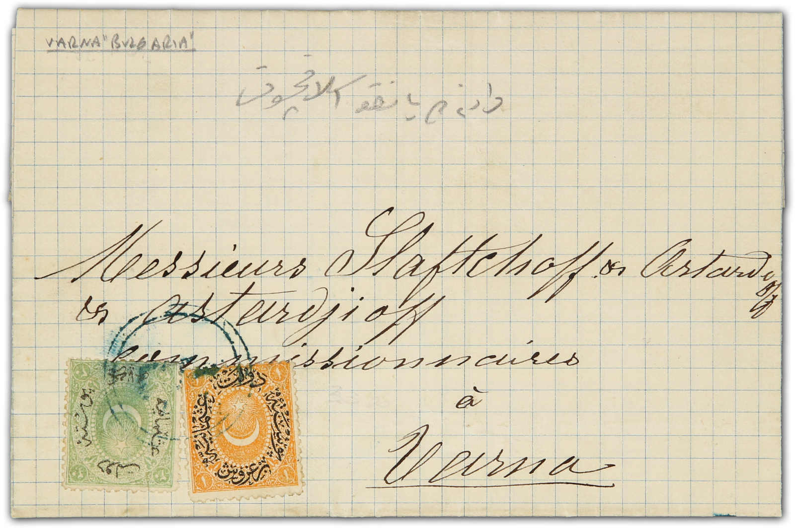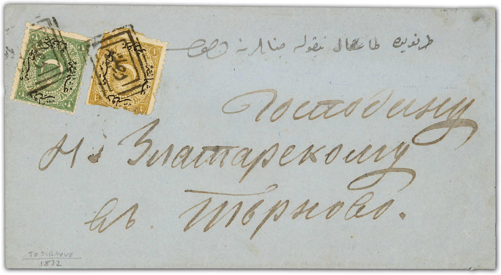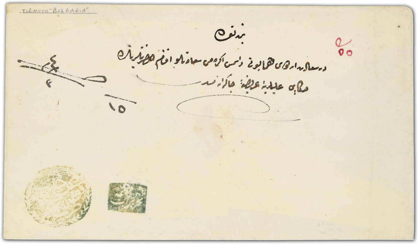 Veliko Tarnovo-Tirnova; 1863, cover from Veliko Tarnovo to Constantinople with superb strike of all Arabic negative "An Canib-i Posta-i Tirnova 1262" handstamp in black (Coles & Walker fig. 77), weight 3 Dirhem / postal charge 2 piastre